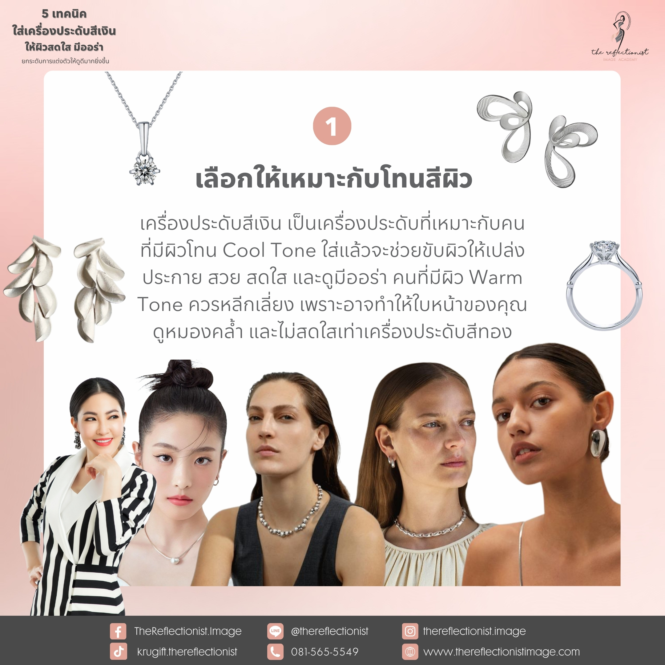 เครื่องประดับสีเงิน เป็นเครื่องประดับที่เหมาะกับคนที่มีผิวโทน Cool Tone ใส่แล้วจะช่วยขับผิวให้เปล่งประกาย สวย สดใส และดูมีออร่า คนที่มีผิว Warm Tone ควรหลีกเลี่ยง เพราะอาจทำให้ใบหน้าของคุณดูหมองคล้ำ และไม่สดใสเท่าเครื่องประดับสีทอง