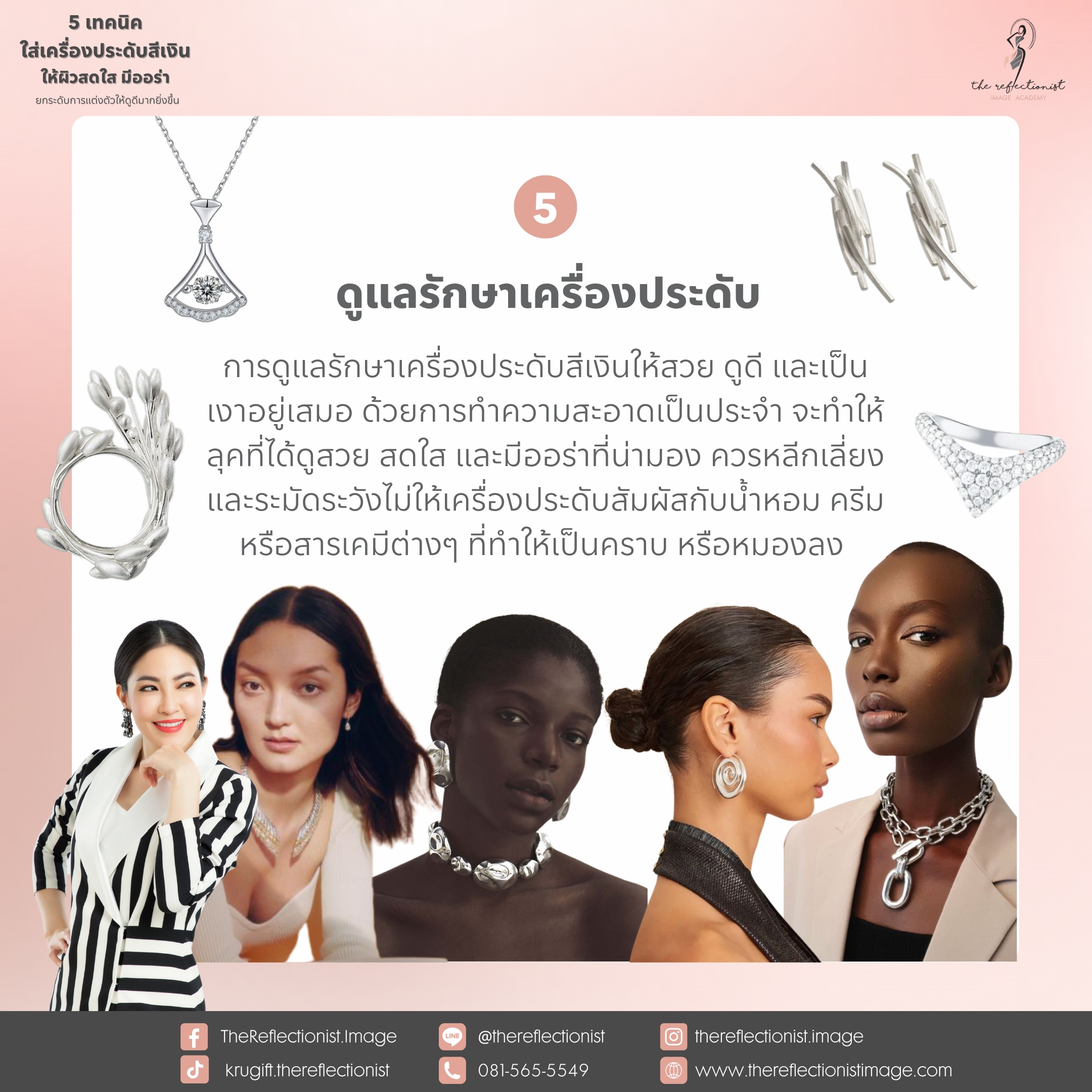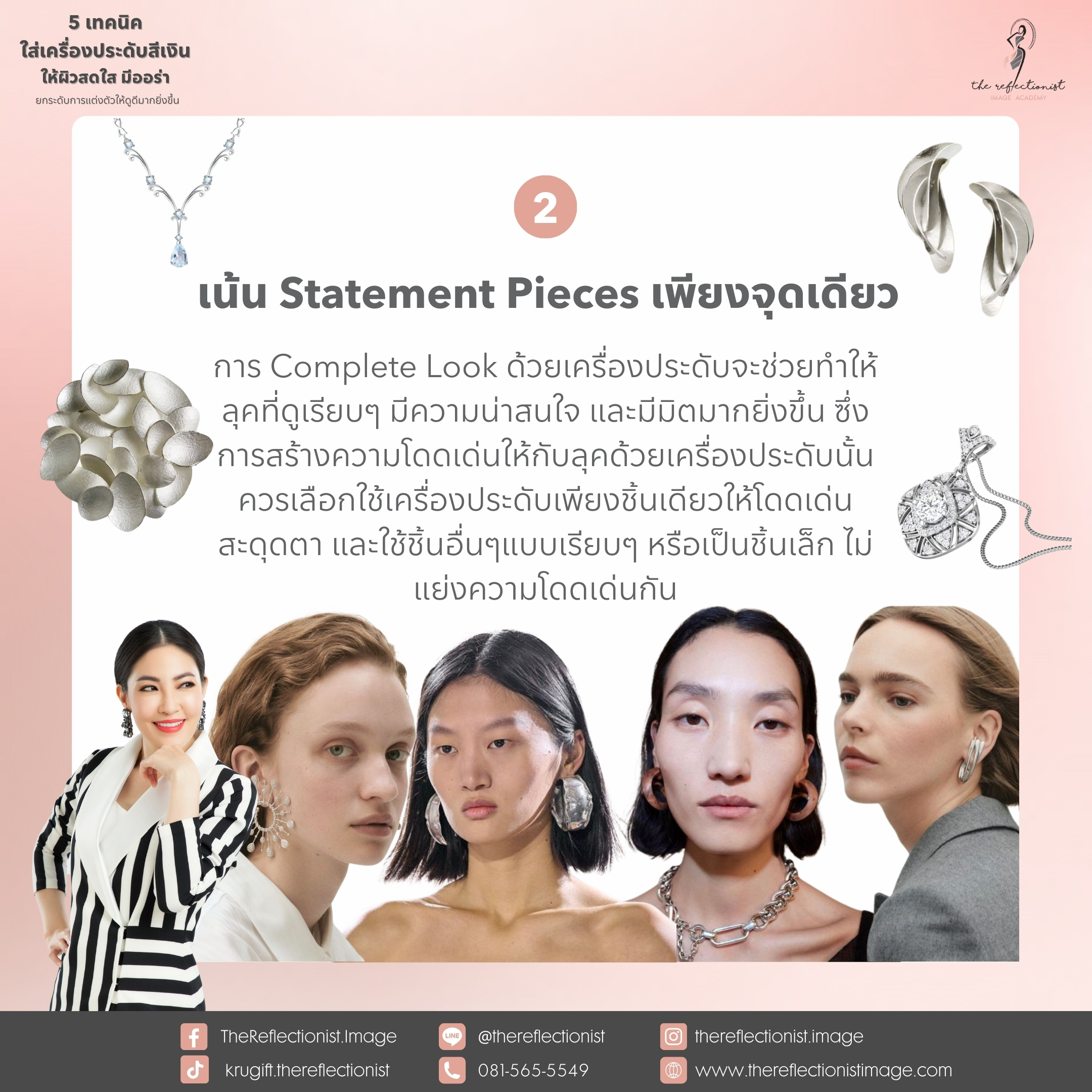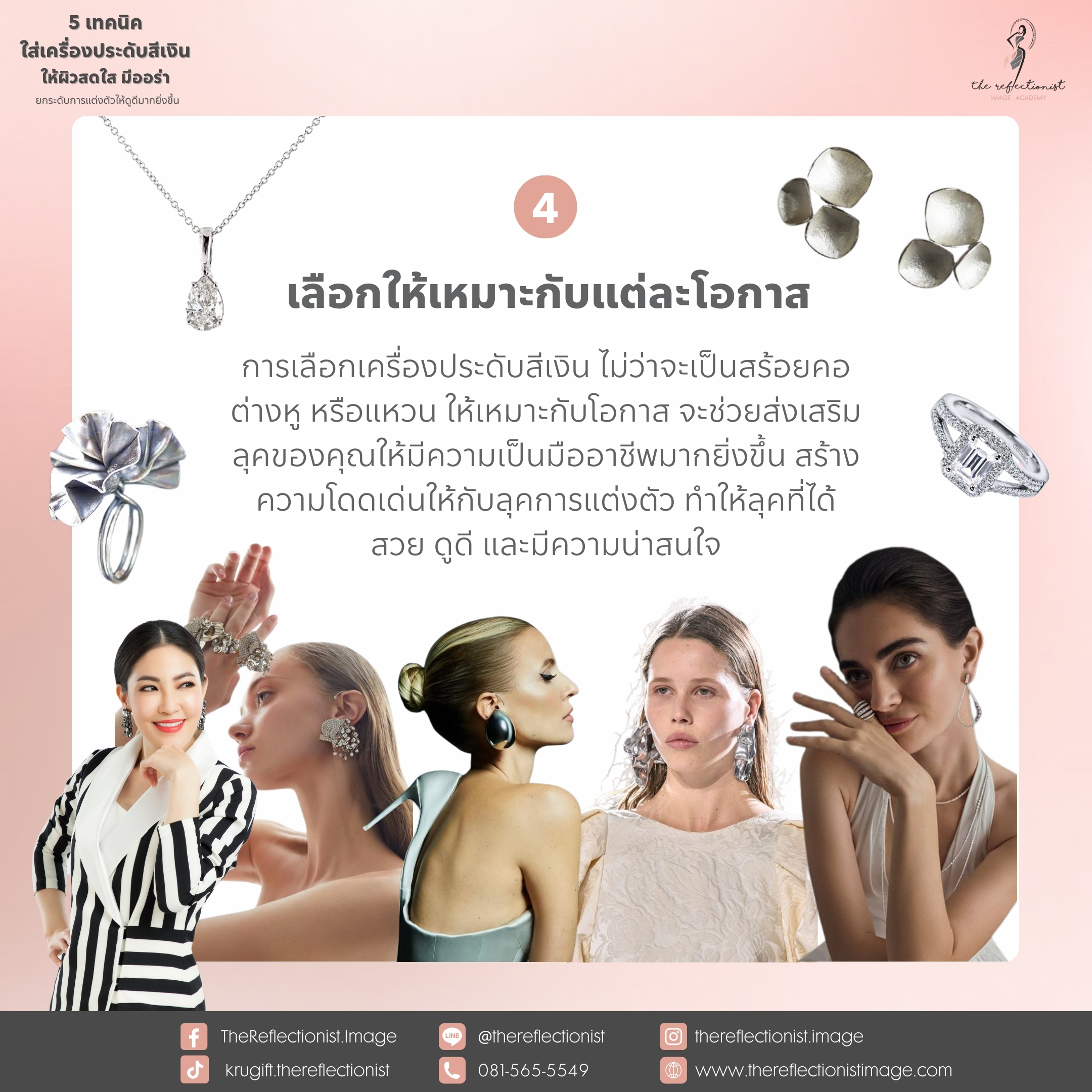 การเลือกเครื่องประดับสีเงิน ไม่ว่าจะเป็นสร้อยคอ ต่างหู หรือแหวน ให้เหมาะกับโอกาส จะช่วยส่งเสริม ลุคของคุณให้มีความเป็นมืออาชีพมากยิ่งขึ้น สร้างความโดดเด่นให้กับลุคการแต่งตัว ทำให้ลุคที่ได้ สวย ดูดี และมีความน่าสนใจ