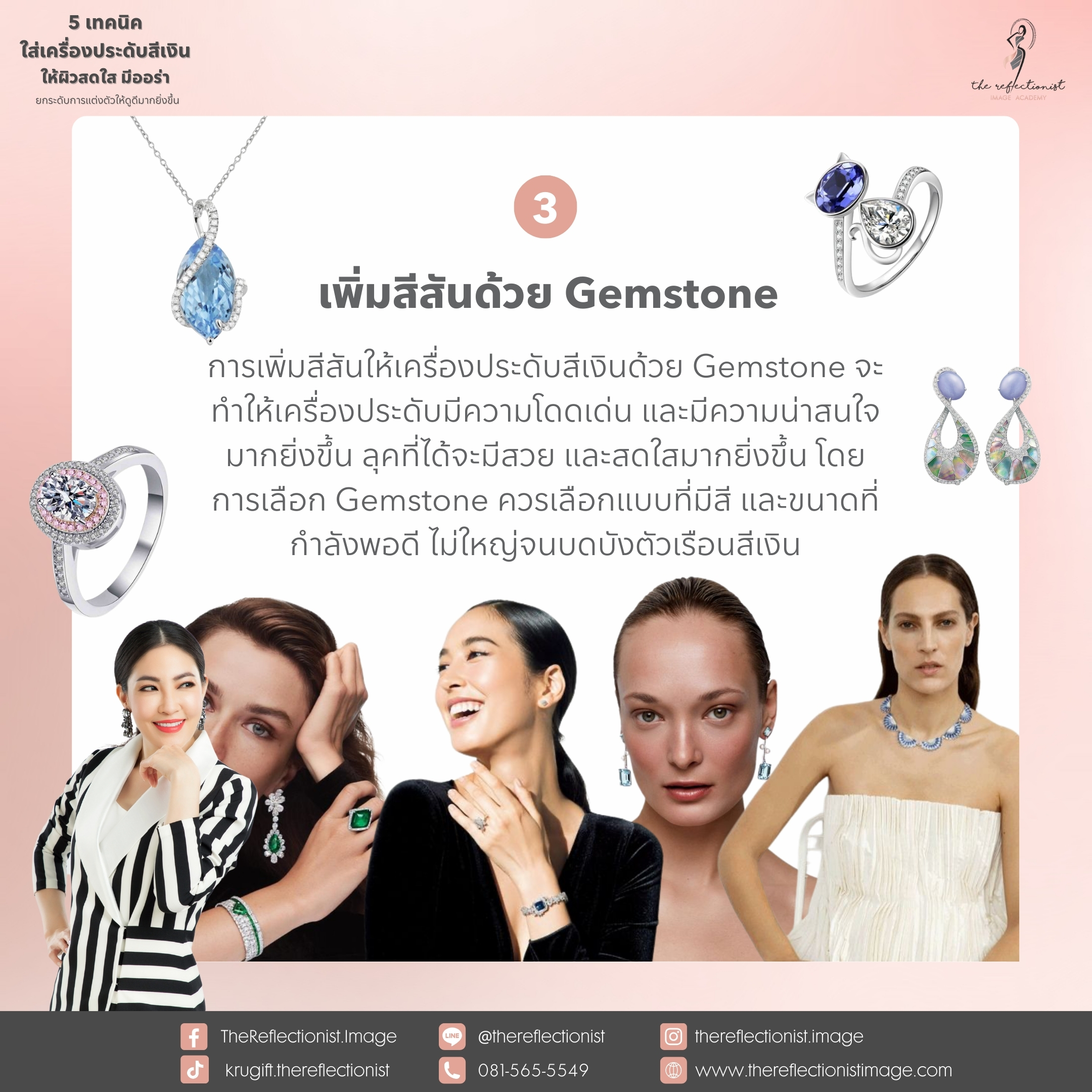 การเพิ่มสีสันให้เครื่องประดับสีเงินด้วย Gemstone จะทำให้เครื่องประดับมีความโดดเด่น และมีความน่าสนใจมากยิ่งขึ้น ลุคที่ได้จะมีสวย และสดใสมากยิ่งขึ้น โดยการเลือก Gemstone ควรเลือกแบบที่มีสี และขนาดที่กำลังพอดี ไม่ใหญ่จนบดบังตัวเรือนสีเงิน