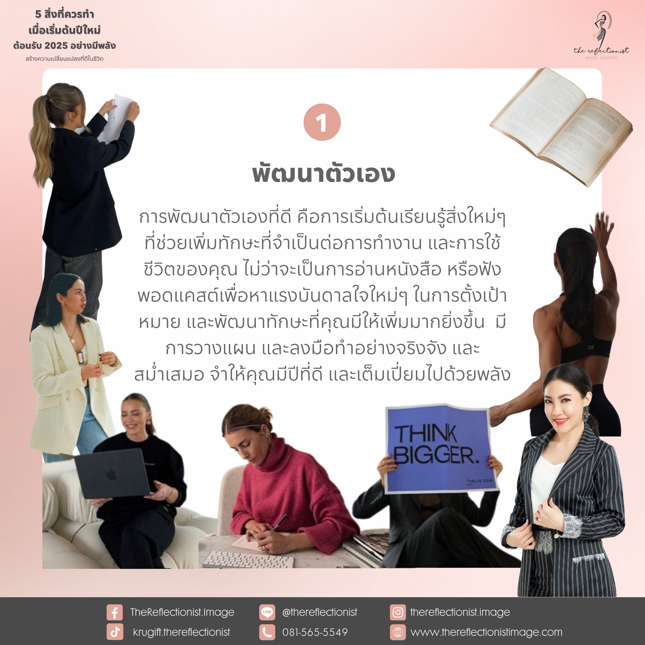 การพัฒนาตัวเองที่ดี คือการเริ่มต้นเรียนรู้สิ่งใหม่ๆ ที่ช่วยเพิ่มทักษะที่จำเป็นต่อการทำงาน และการใช้ชีวิตของคุณ ไม่ว่าจะเป็นการอ่านหนังสือ หรือฟังพอดแคสต์เพื่อหาแรงบันดาลใจใหม่ๆ ในการตั้งเป้าหมาย และพัฒนาทักษะที่คุณมีให้เพิ่มมากยิ่งขึ้น มีการวางแผน และลงมือทำอย่างจริงจัง และสม่ำเสมอ จำให้คุณมีปีที่ดี และเต็มเปี่ยมไปด้วยพลัง