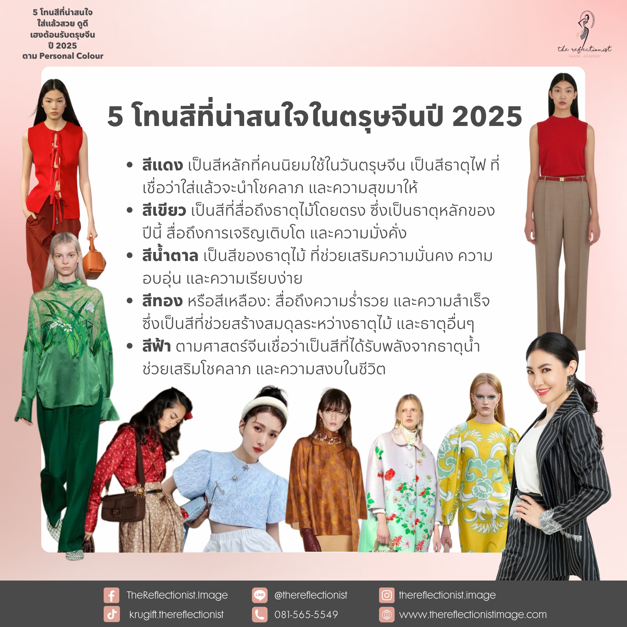 และเพื่อให้คุณได้สนุกกับการแต่งตัวในวันตรุษจีนปี 2025 ซึ่งเป็น ปีงูธาตุไม้ ครูกิ๊ฟมี 5 โทนสีที่เหมาะกับตรุษจีนปีนี้มาแนะนำค่ะ ซึ่งแต่ละสีมีความหมายดี และช่วยเพิ่มความหลากหลายให้การแต่งตัวของคุณมากขึ้น คุณสามารถอ่านความหมาย และเลือกสีให้เหมาะกับ Personal Colour ของคุณ ได้ดังนี้เลยค่ะ