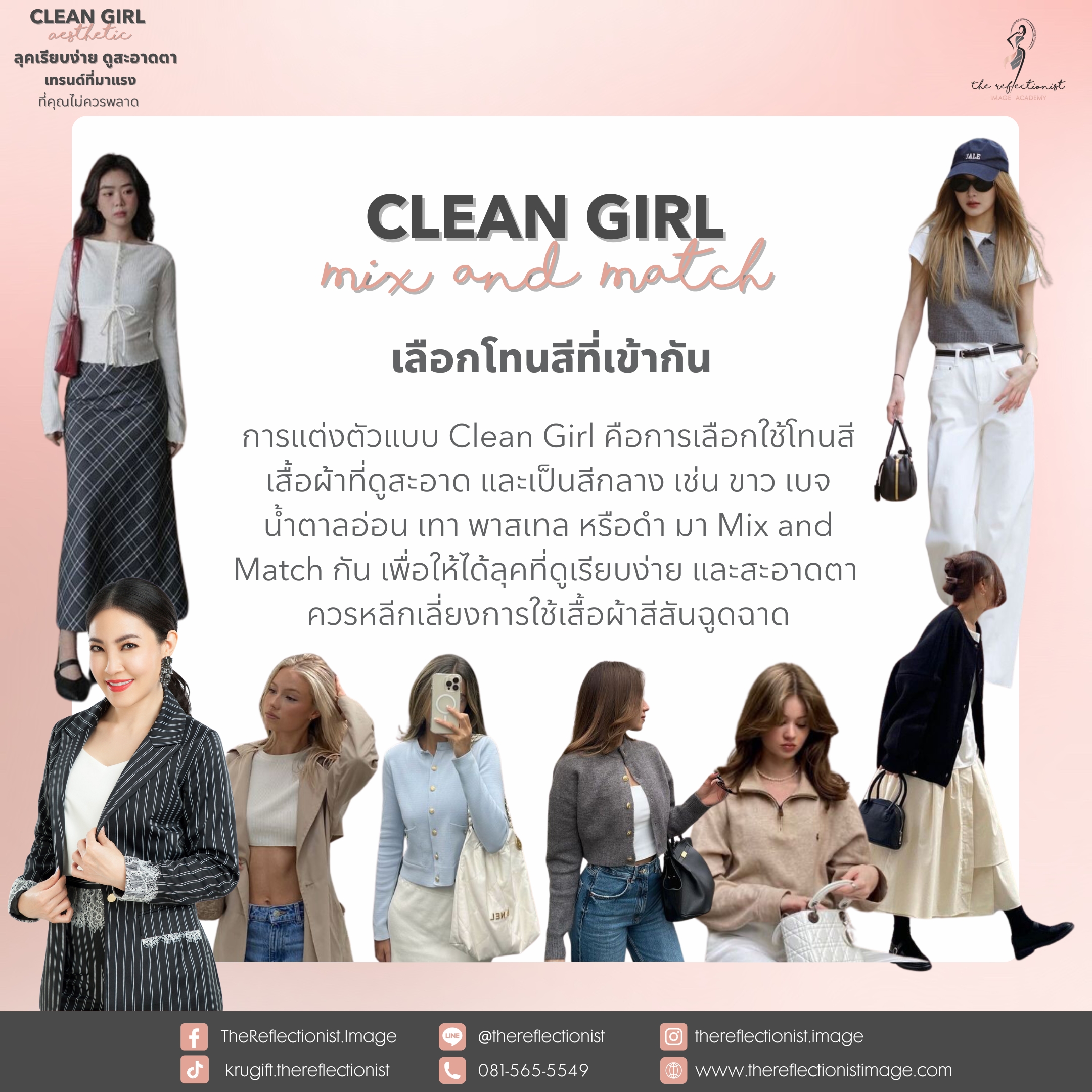 การแต่งตัวแบบ Clean Girl คือการเลือกใช้โทนสีเสื้อผ้าที่ดูสะอาด และเป็นสีกลาง เช่น ขาว เบจ น้ำตาลอ่อน เทา พาสเทล หรือดำ มา Mix and Match กัน เพื่อให้ได้ลุคที่ดูเรียบง่าย และสะอาดตา ควรหลีกเลี่ยงการใช้เสื้อผ้าสีสันฉูดฉาด
