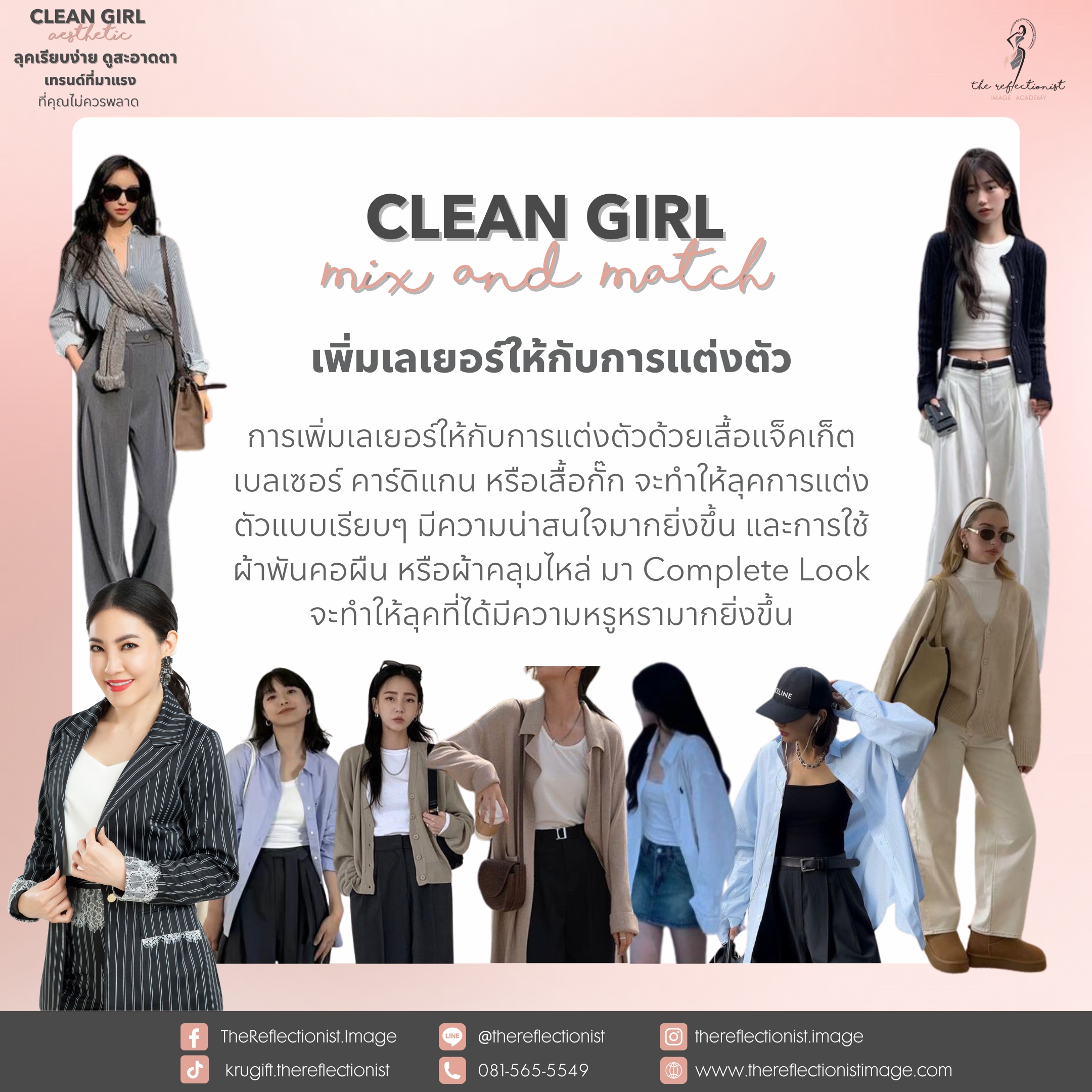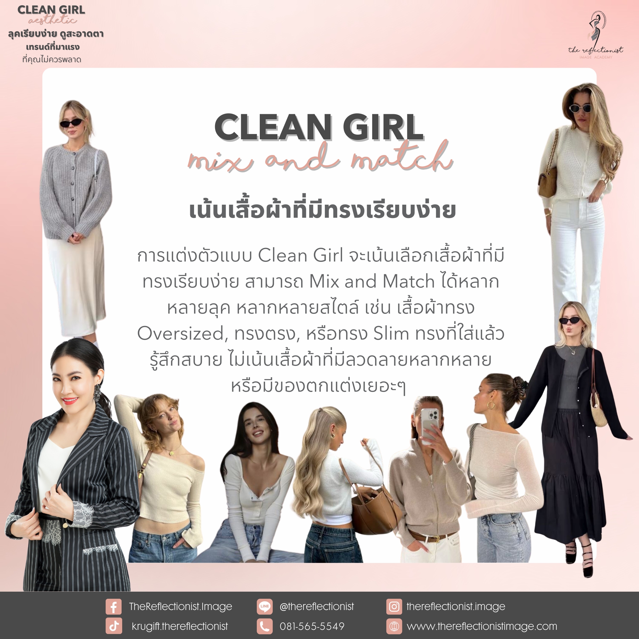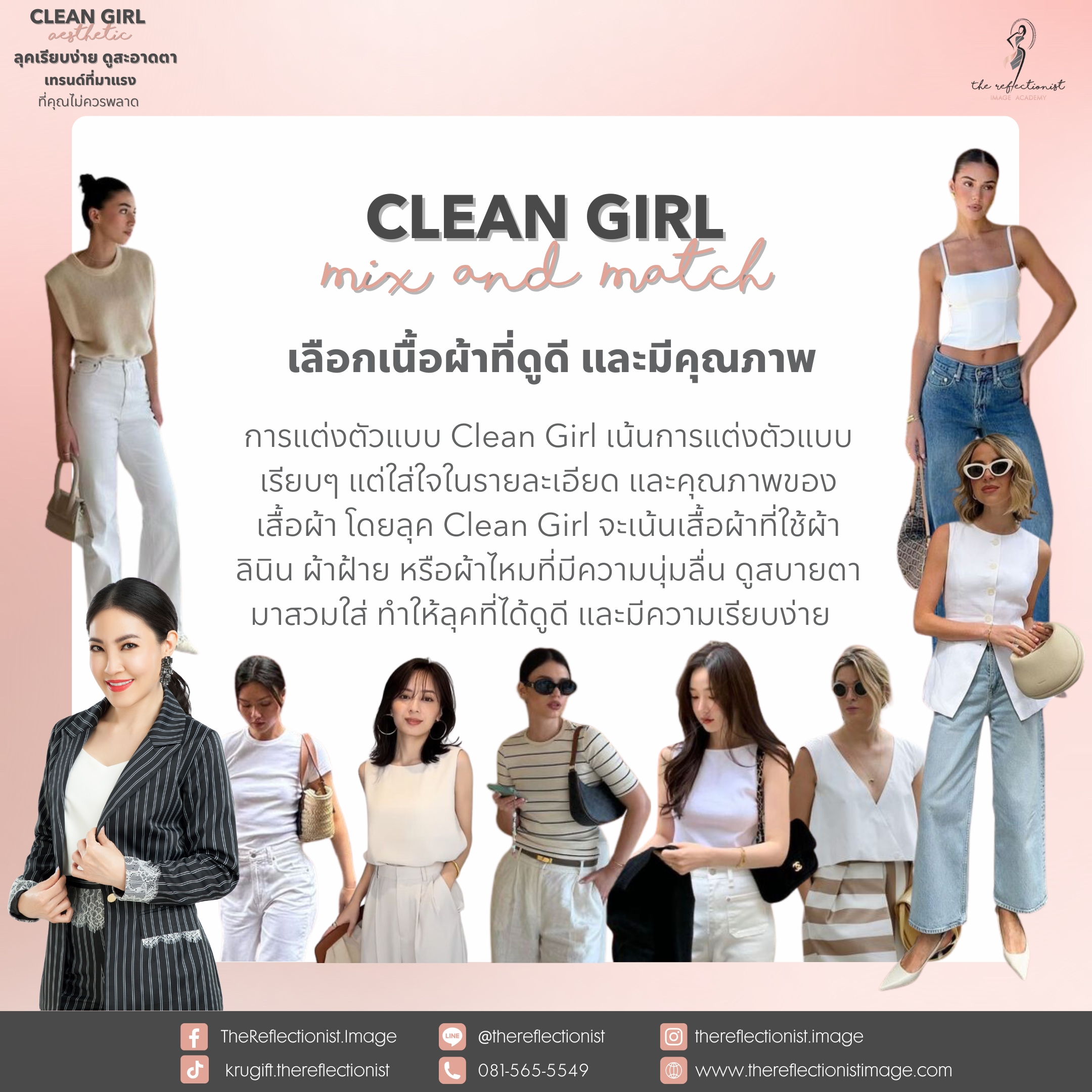 การแต่งตัวแบบ Clean Girl เน้นการแต่งตัวแบบเรียบๆ แต่ใส่ใจในรายละเอียด และคุณภาพของเสื้อผ้า โดยลุค Clean Girl จะเน้นเสื้อผ้าที่ใช้ผ้าลินิน ผ้าฝ้าย หรือผ้าไหมที่มีความนุ่มลื่น ดูสบายตา มาสวมใส่ ทำให้ลุคที่ได้ดูดี และมีความเรียบง่าย