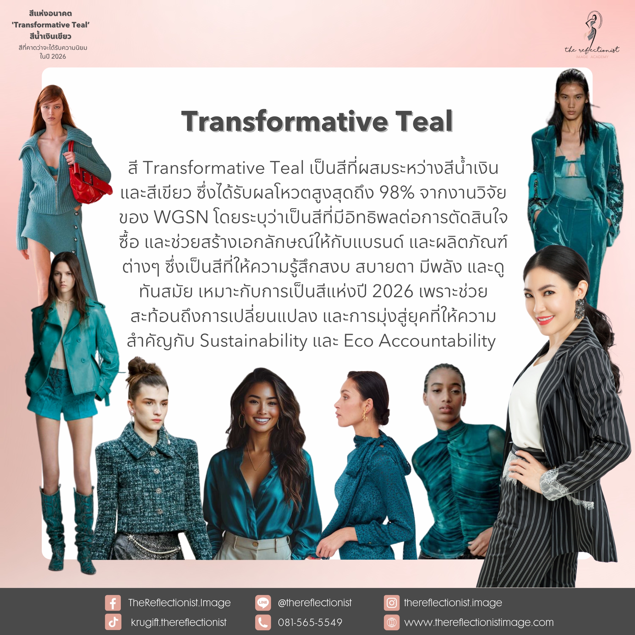สี Transformative Teal เป็นสีที่ผสมระหว่างสีน้ำเงิน และสีเขียว ซึ่งได้รับผลโหวตสูงสุดถึง 98% จากงานวิจัยของ WGSN โดยระบุว่าเป็นสีที่มีอิทธิพลต่อการตัดสินใจซื้อ และช่วยสร้างเอกลักษณ์ให้กับแบรนด์ และผลิตภัณฑ์ต่างๆ ซึ่งเป็นสีที่ให้ความรู้สึกสงบ สบายตา มีพลัง และดูทันสมัย เหมาะกับการเป็นสีแห่งปี 2026 เพราะช่วยสะท้อนถึงการเปลี่ยนแปลง และการมุ่งสู่ยุคที่ให้ความสำคัญกับ Sustainability และ Eco Accountability