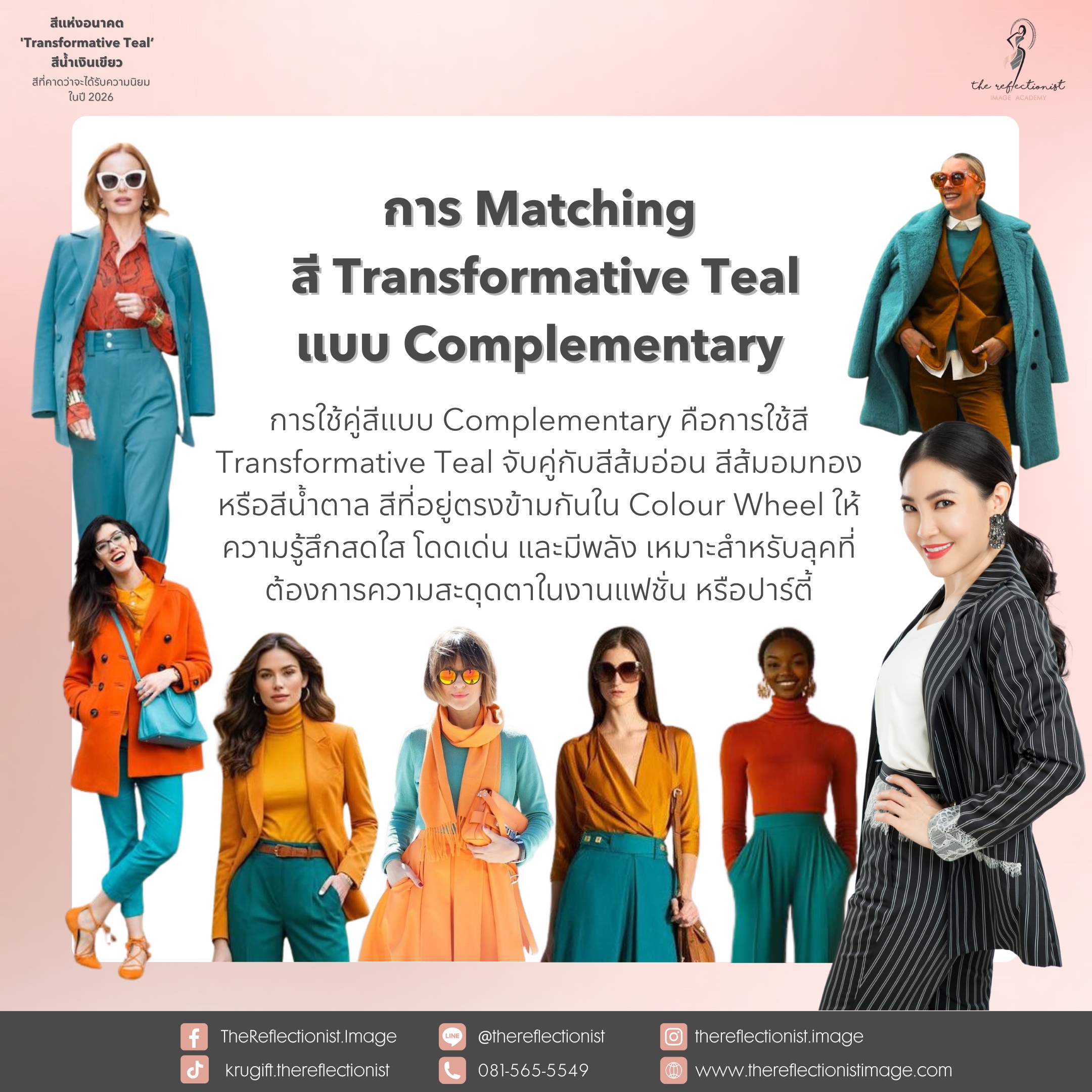 การใช้คู่สีแบบ Complementary คือการใช้สี Transformative Teal จับคู่กับสีส้มอ่อน สีส้มอมทองหรือสีน้ำตาล สีที่อยู่ตรงข้ามกันใน Colour Wheel ให้ความรู้สึกสดใส โดดเด่น และมีพลัง เหมาะสำหรับลุคที่ต้องการความสะดุดตาในงานแฟชั่น หรือปาร์ตี้