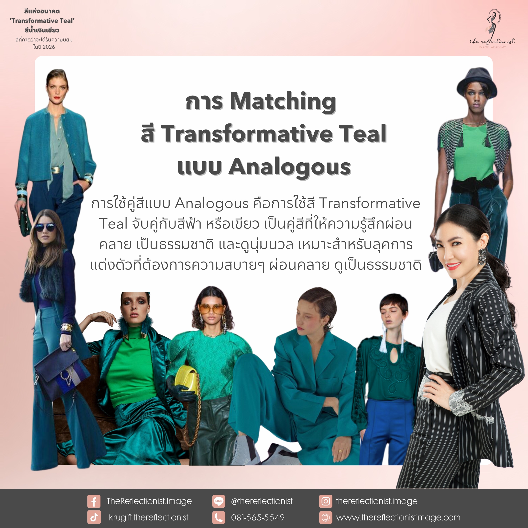 สี Transformative Teal เป็นสีที่คุณสามารถเลือกใส่ได้ง่ายๆ เพราะมีค่าเป็นโทนกลางๆที่ไม่ว่าจะเป็น Cool Tone หรือว่า Warm Tone ก็สามารถนำไป Matching กับสีที่ใช่ของคุณได้ ซึ่งเป็นโทนสีที่น่าสนใจ ที่จะช่วยให้คุณสนุกกับการแต่งตัวมากยิ่งขึ้น