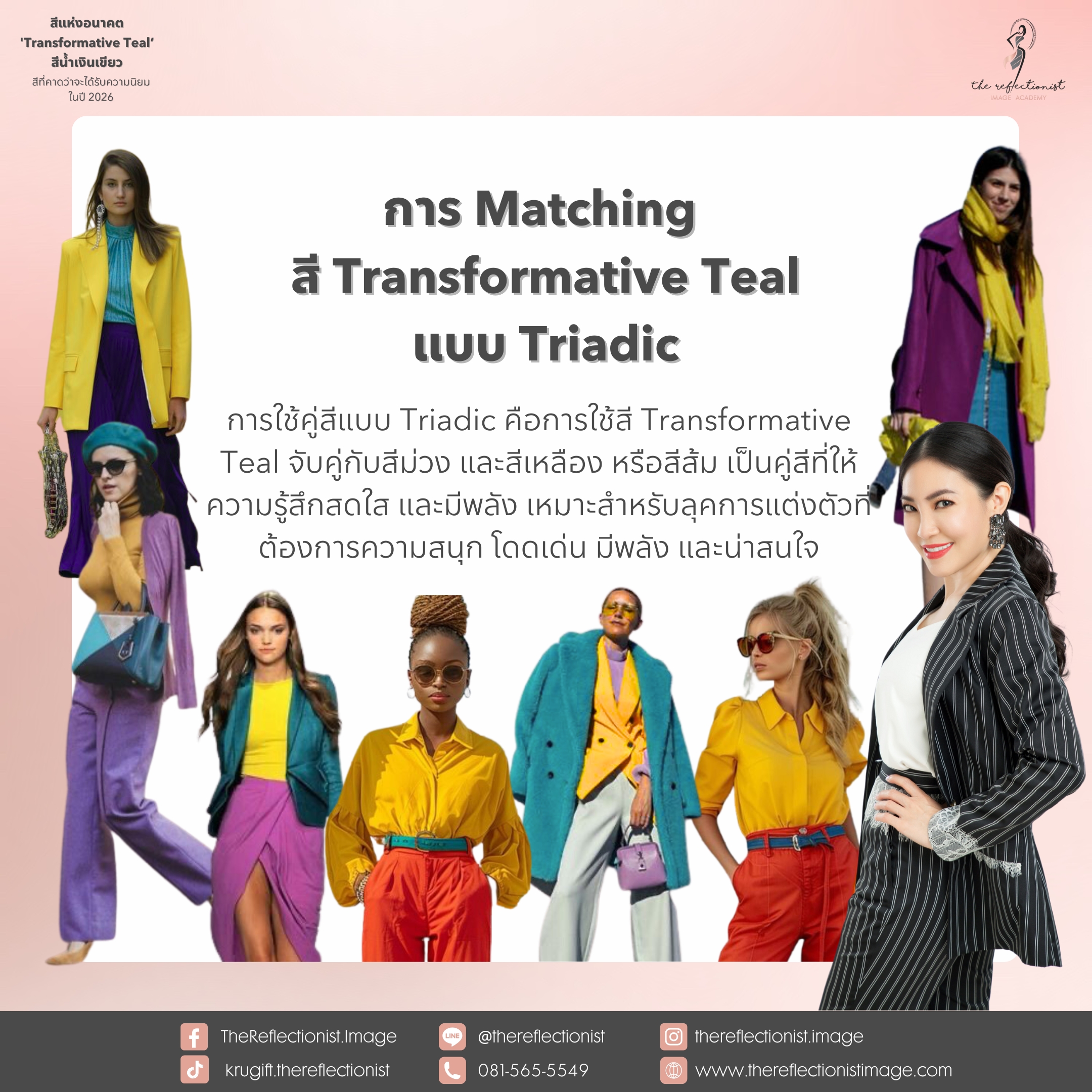 การใช้คู่สีแบบ Triadic คือการใช้สี Transformative Teal จับคู่กับสีม่วง และสีเหลือง หรือสีส้ม เป็นคู่สีที่ให้ความรู้สึกสดใส และมีพลัง เหมาะสำหรับลุคการแต่งตัวที่ต้องการความสนุก โดดเด่น มีพลัง และน่าสนใจ
