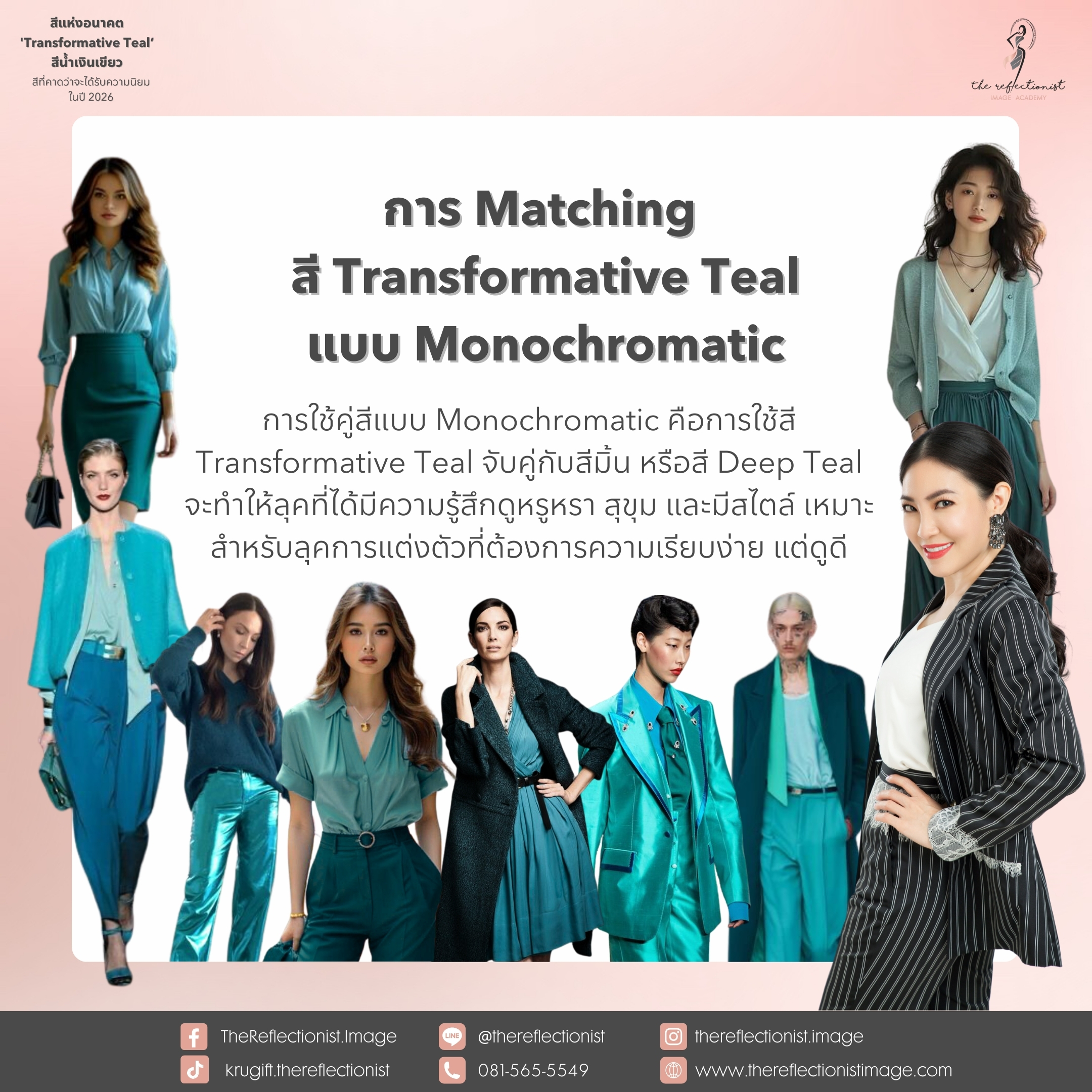 การใช้คู่สีแบบ Monochromatic คือการใช้สี Transformative Teal จับคู่กับสีมิ้น หรือสี Deep Teal จะทำให้ลุคที่ได้มีความรู้สึกดูหรูหรา สุขุม และมีสไตล์ เหมาะสำหรับลุคการแต่งตัวที่ต้องการความเรียบง่าย แต่ดูดี