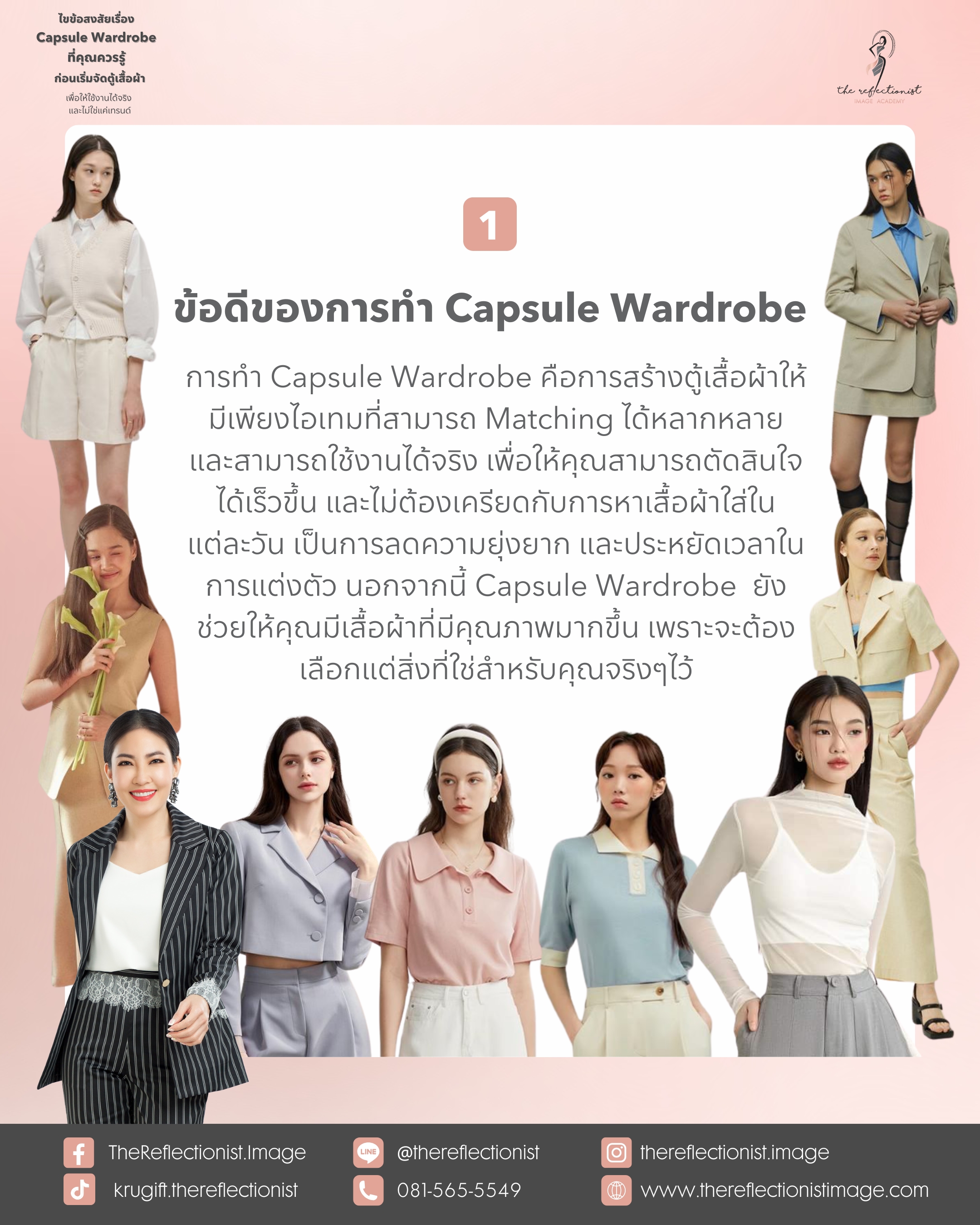 การมี Capsule Wardrobe ที่ดีจะช่วยให้คุณตัดสินใจเรื่องการแต่งตัวในแต่ละวันได้ง่ายยิ่งขึ้น และช่วยลดความยุ่งยากในการเลือกเสื้อผ้าที่ไม่ใช่ เพราะในตู้ของคุณนั้นจะมีแต่ตัวเลือกที่เป็นสไตล์ของคุณ สามารถ Mix and Match กันได้ง่าย เพราะผ่านการคัดสรรมาอย่างดีว่าเป็นสีที่ใช่ และเป็นสไตล์ที่ชอบ เหมาะกับการใช้ชีวิตของคุณในแต่ละวัน