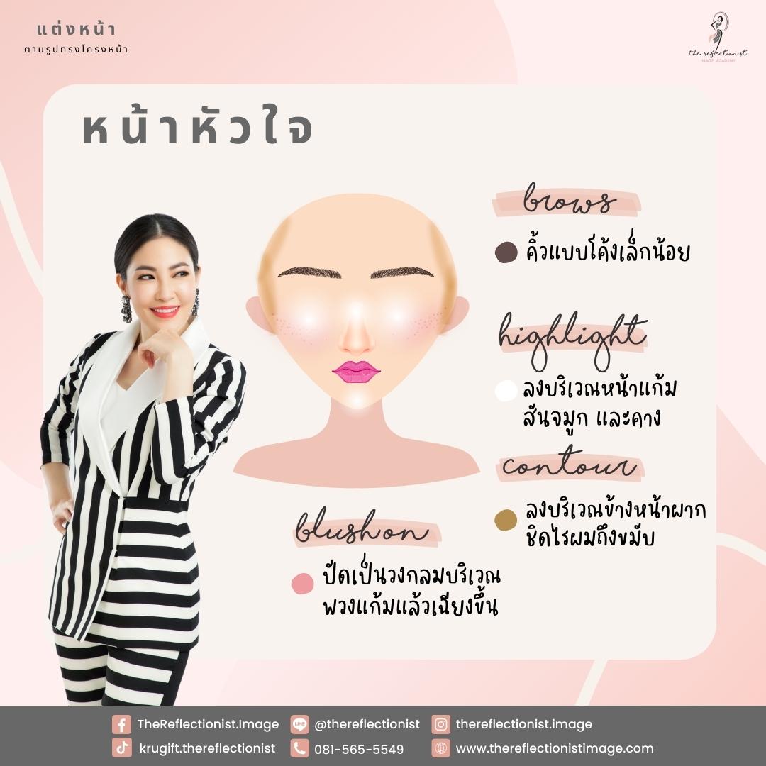 ลักษณะใบหน้า: คนที่มีใบหน้ารูปทรงหัวใจ เป็นคนที่จะมีหน้าผากกว้าง ช่วงคางแหลม ช่วงใบหน้าจะเรียวจนถึงคาง สัดส่วนของใบหน้าช่วงบนจะกว้างกว่าช่วงล่าง