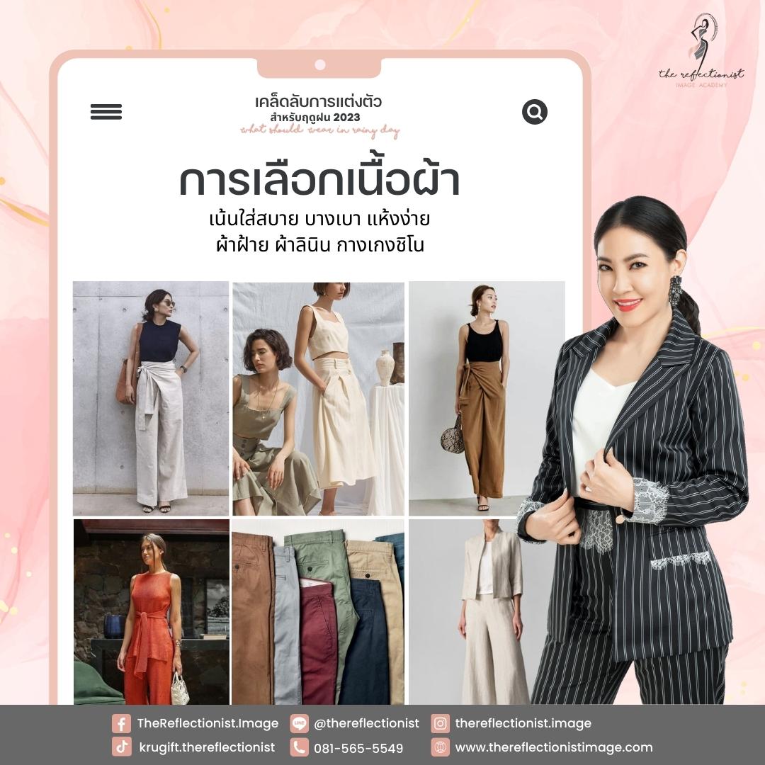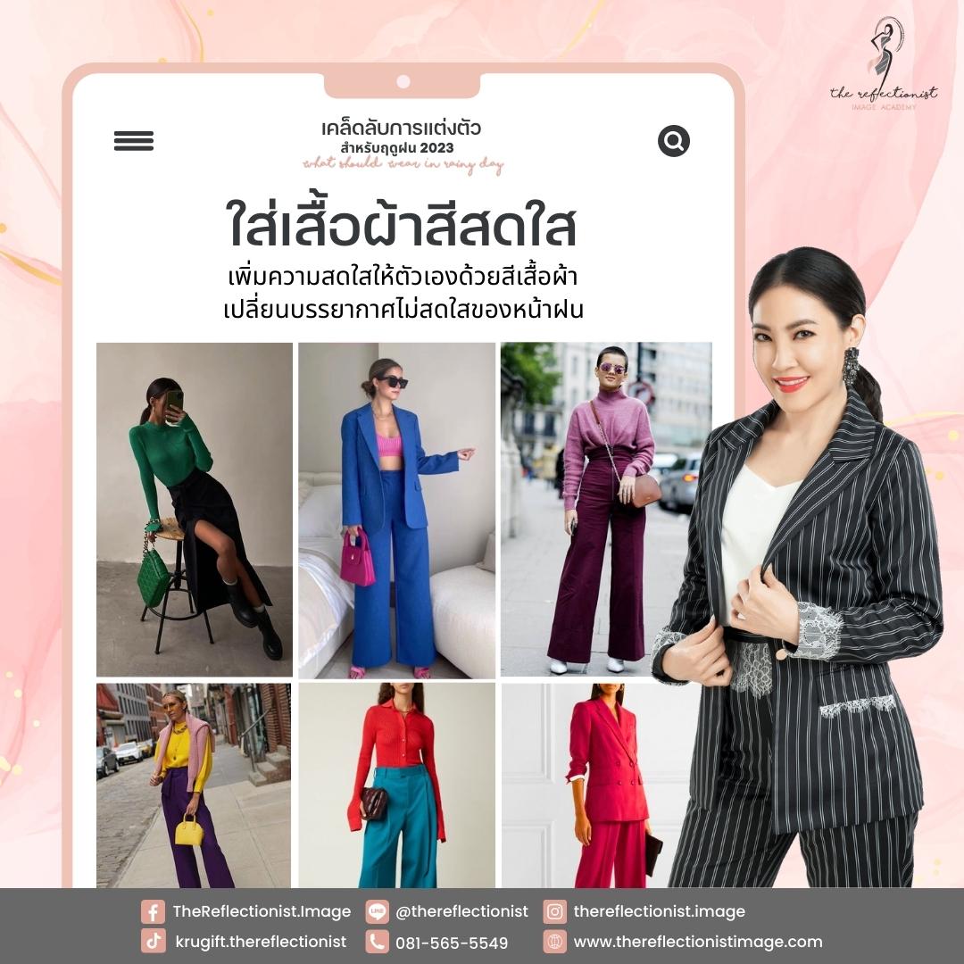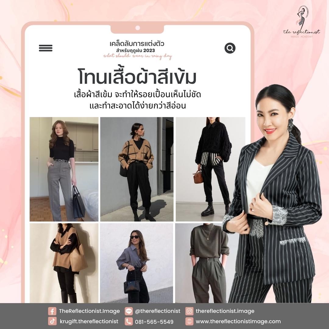 ช่วงนี้ครูกิ๊ฟแนะนำให้เก็บเสื้อผ้าสีอ่อนเข้าตู้ไปก่อน แล้วหยิบเสื้อผ้าสีเข้มมาใส่แทนค่ะ เพราะว่าเสื้อผ้าสีอ่อนนอกจากจะดูโป๊เวลาโดนฝนแล้ว ยังเลอะง่ายอีกด้วยค่ะ