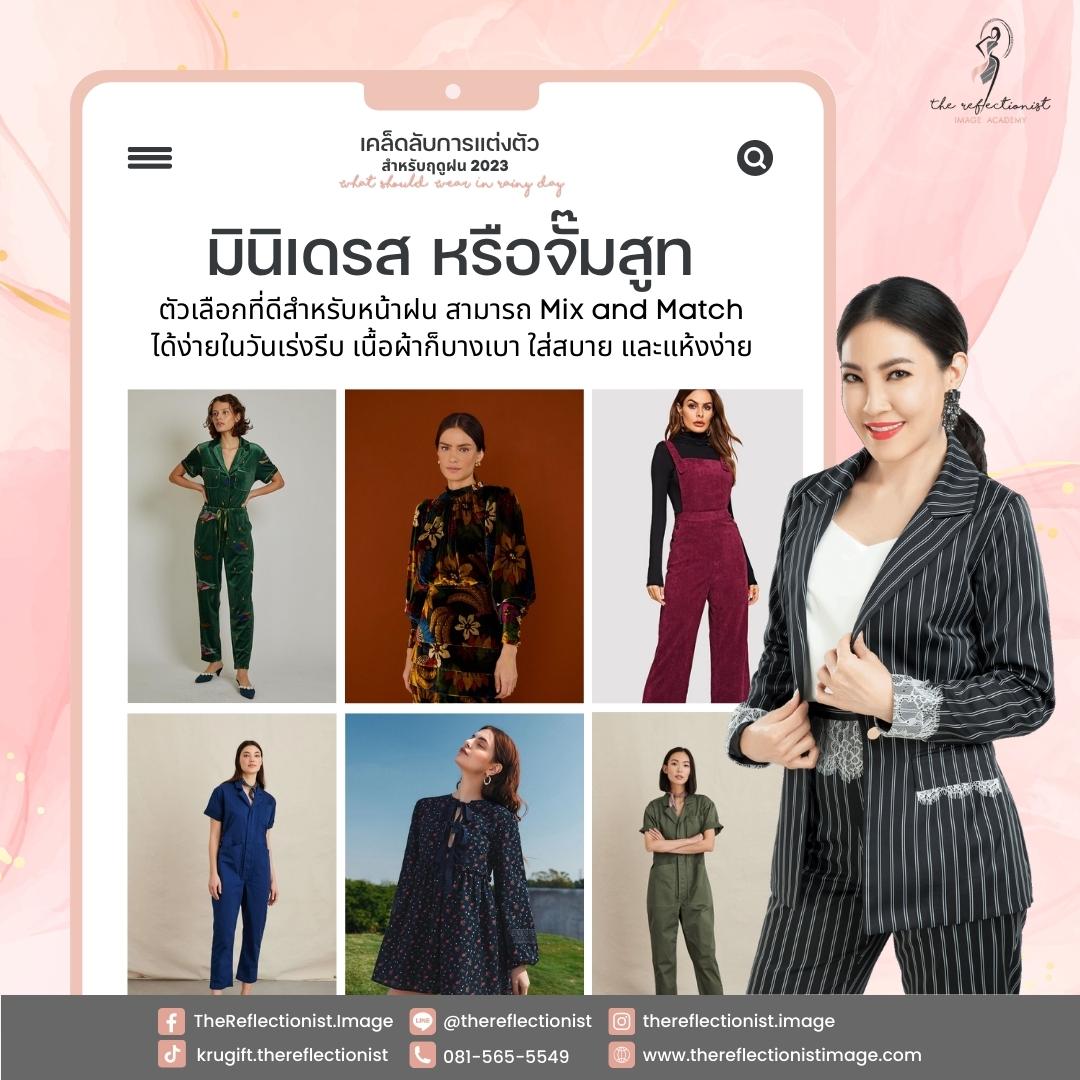 เดรส และจั๊มสูท ถือเป็นตัวเลือกที่ดีสำหรับการเลือกเสื้อผ้ามาใส่ในหน้าฝนเลยค่ะ เพราะนอกจากคุณจะไม่ต้องใช้เวลาเยอะในการ Mix and Match ในวันเร่งรีบแล้ว เนื้อผ้าส่วนใหญ่ของชุดประเภทนี้จะเน้นใช้เนื้อผ้าที่บางเบา และแห้งง่าย เหมาะกับหน้าฝนมากๆเลยค่ะ