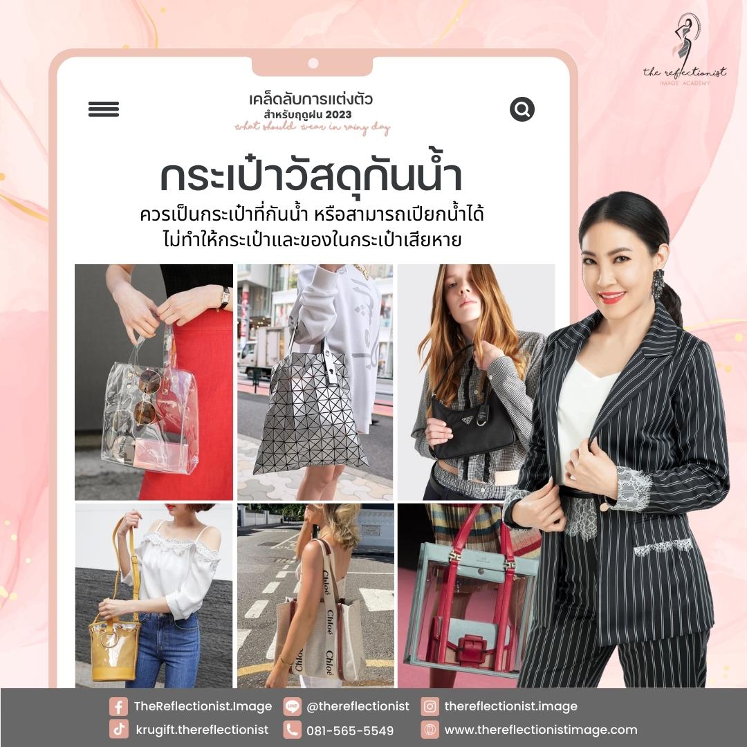 นอกจากเสื้อผ้า และรองเท้าแล้ว Accessory ที่สำคัญอีกอย่างที่ครูกิ๊ฟอยากให้คุณใส่ใจเช่นกันก็คือ กระเป๋า ค่ะ ควรเลือกกระเป๋าที่ใช้วัสดุกันน้ำ หรือสามารถโดนน้ำแล้วจะไม่เสียหายทั้งกับกระเป๋าและของด้านในนะคะ ที่สำคัญคุณอย่าลืมที่จะพกร่ม ติดกระเป๋าไว้ด้วยนะคะ