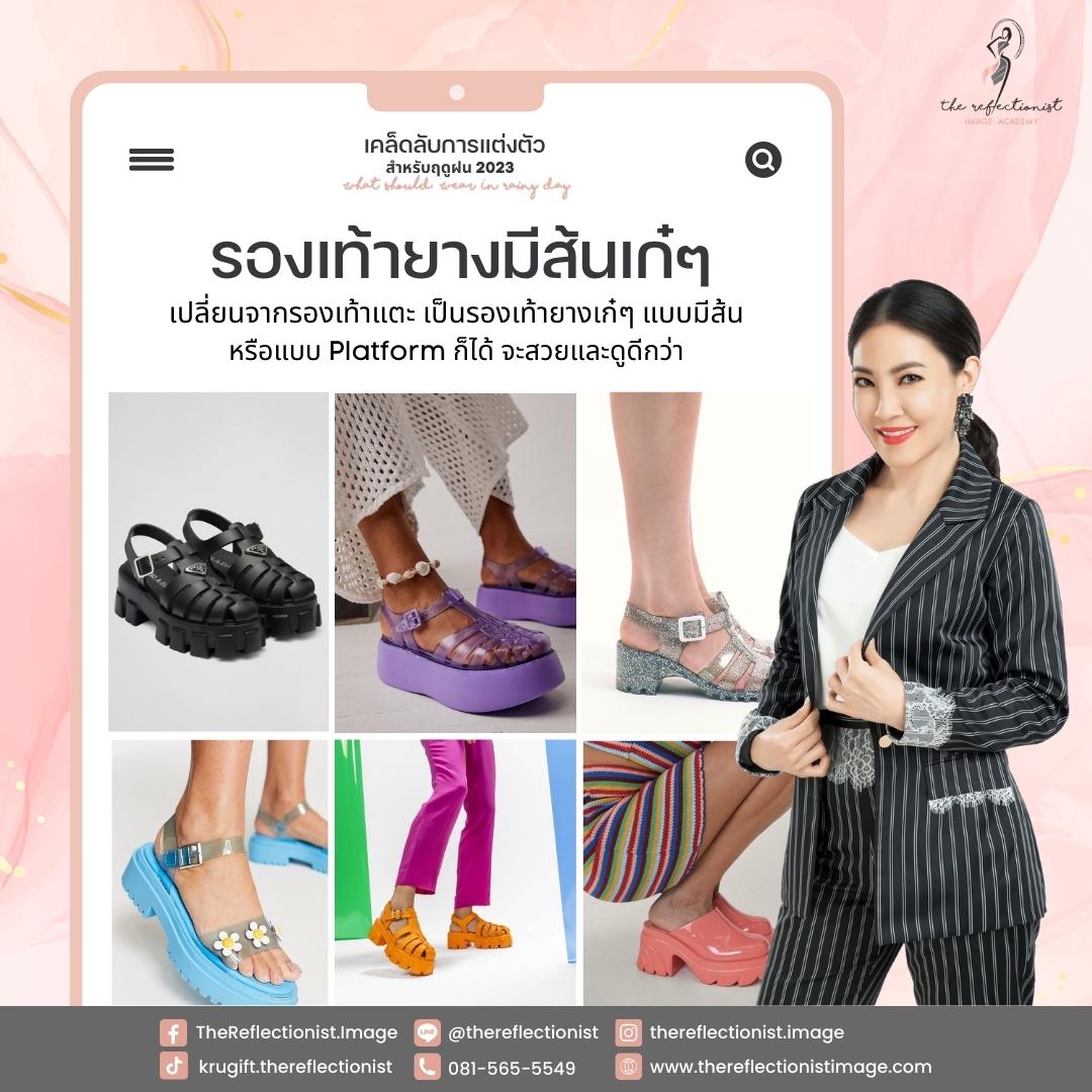 คุณอาจคิดว่ารองเท้าแตะเท่านั้นที่เหมาะที่สุด แต่บางครั้งรองเท้าแตะอาจทำให้เท้าคุณยิ่งเลอะ และเปียกได้ง่าย และยังดูไม่สุภาพในบางโอกาสอีกด้วย อีกทั้งอาจไม่Match กับเสื้อผ้าของคุณค่ะ เพราะฉะนั้นครูกิ๊ฟแนะนำให้เปลี่ยนมาใส่รองเท้าที่ทำจากวัสดุกันน้ำเช่นรองเท้ายางเก๋ๆ แบบมีส้น หรือแบบแพลตฟอร์มแทนค่ะ ส่วนรองเท้าที่ควรหลีกเลี่ยงเลยคือผ้าใบ และรองเท้าหนังแท้ค่ะ