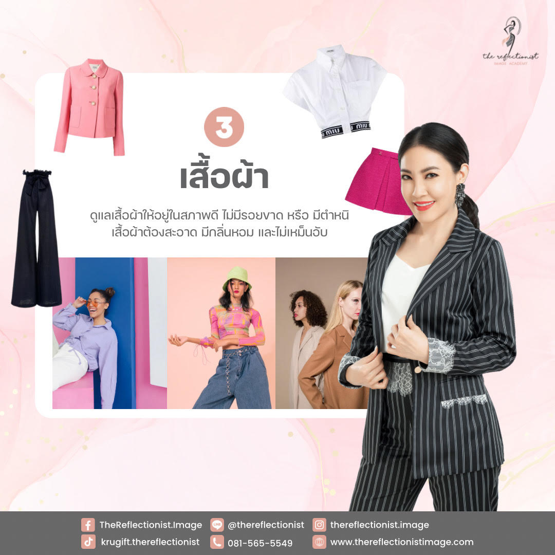 เสื้อผ้าถือเป็นจุดหลักที่เด่นที่สุด ของภาพลักษณ์คุณเลยก็ว่าได้ เพราะเสื้อผ้าจะเป็นอันดับแรกๆ ที่คนจะมองเห็น ครูกิ๊ฟเลยอยากแนะนำให้คุณใส่ใจเป็นพิเศษ เพราะนอกจากจะใส่เสื้อผ้าในสไตล์ และสีที่ใช่แล้ว