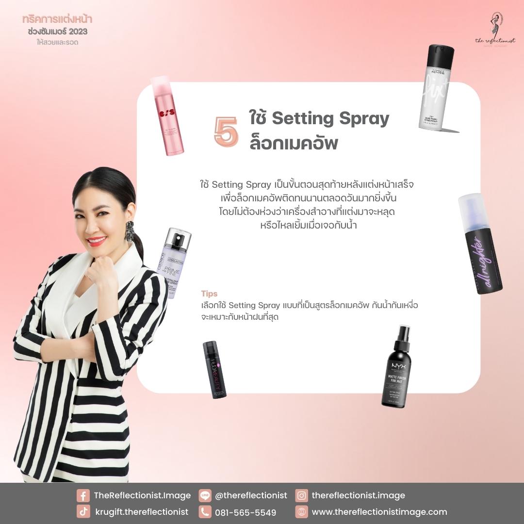 การใช้ Setting Spray ในการล็อกเมคอัพไว้หลังแต่งหน้าเสร็จ จะช่วยให้เครื่องสำอางติดทนอยู่บนหน้าของคุณนานได้มากยิ่งขึ้นตลอดทั้งวัน โดยที่ไม่หลุดหายไป หรือเยิ้มเมื่อเจอกับน้ำ สำหรับการเลือกใช้ Setting Spray นั้น ควรเลือกที่เป็นแบบสูตรล็อกเมคอัพ กันน้ำกันเหงื่อ จะเหมาะกับหน้าฝนที่สุดค่ะ