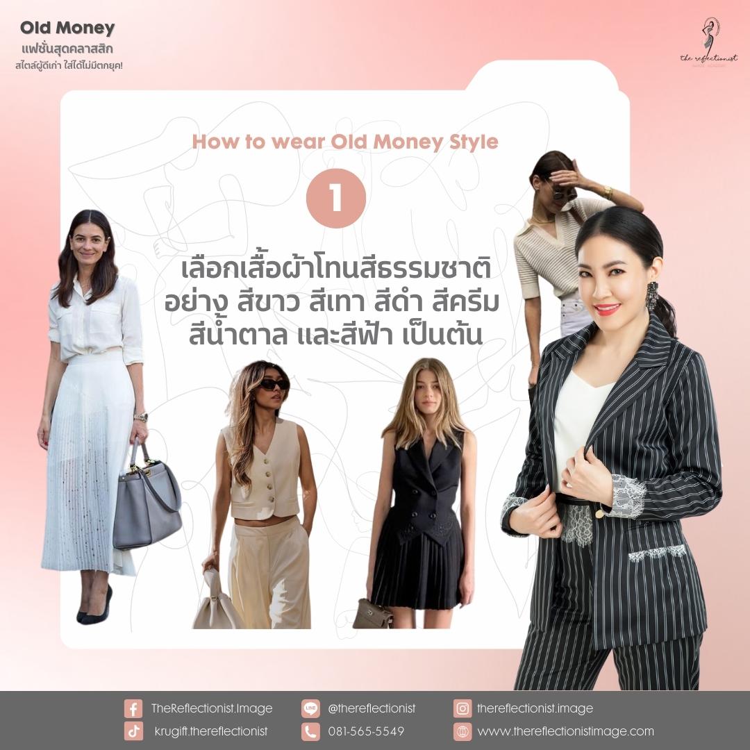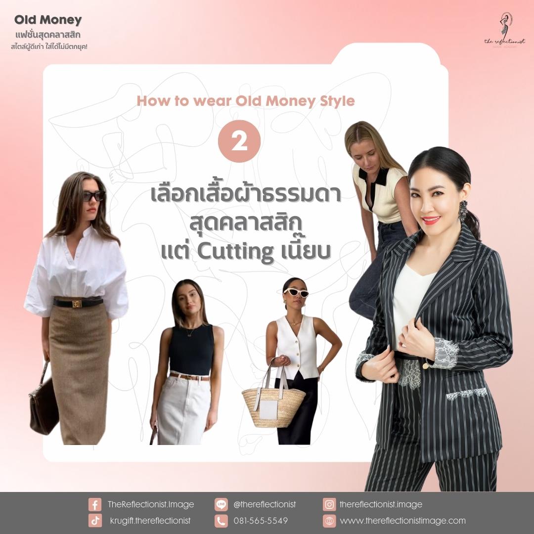 Old Money Style จะเป็นการแต่งตัวแบบ Classic Style ที่เน้นใส่เสื้อผ้าธรรมดาๆ อย่าง เสื้อยืด เสื้อเชิ๊ต เสื้อPolo หรือเสื้อVest เป็นต้น ใส่คู่กับกางเกง หรือกระโปรงยาวสีพื้นแบบเรียบๆ แต่ลุคที่ได้มีเสน่ห์ ให้ความหรูหรา เพราะให้ความสำคัญกับการตัดเย็บที่จะต้องมีความประณีต ตัดเย็บอย่างดี ทำให้ลุคที่ออกมามีความเป็น Classic Style ที่แต่งได้ทุกช่วงเวลาไม่มีเบื่อนั่นเองค่ะ