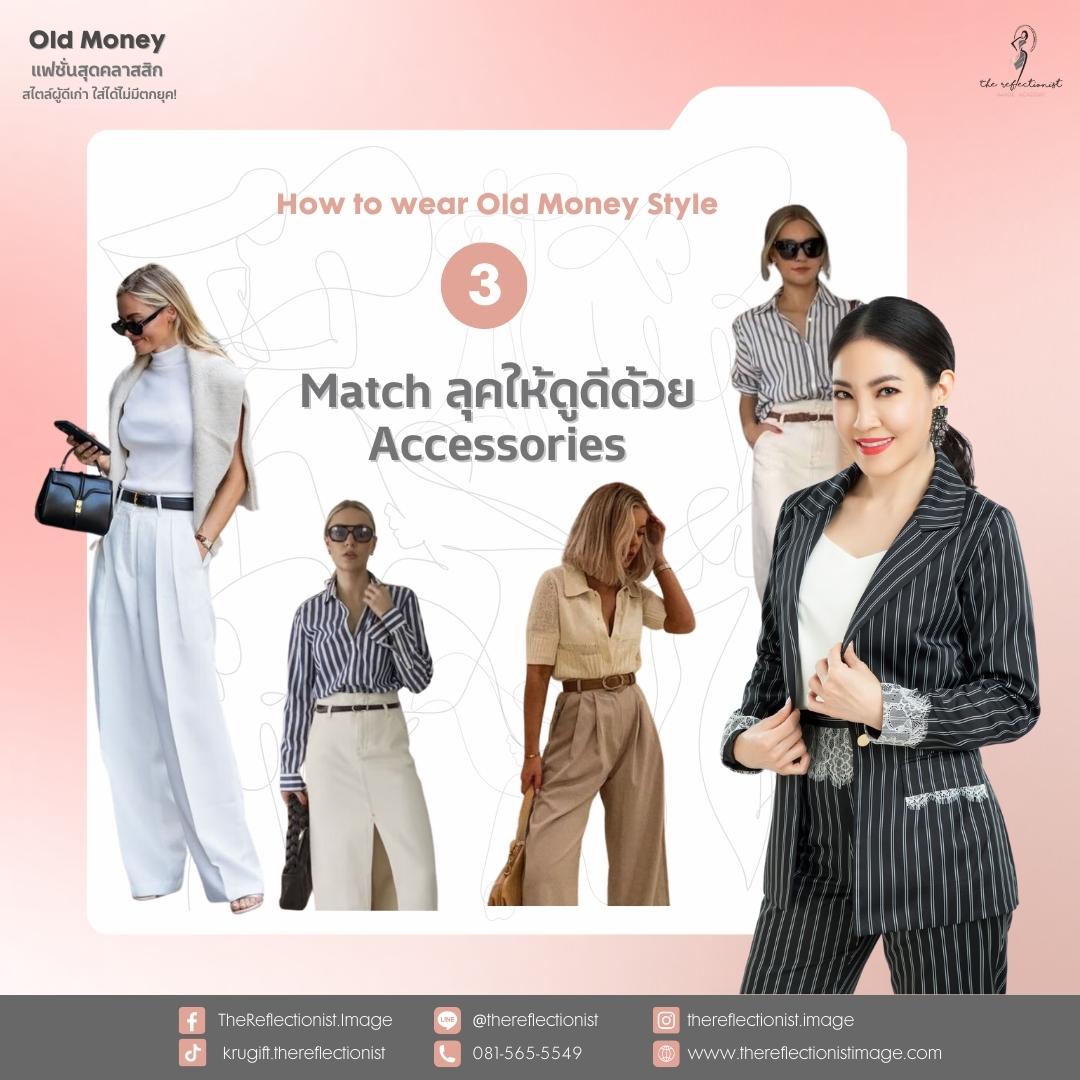 แม้ว่าการแต่งตัวสไตล์นี้จะดูเหมือนธรรมดาแต่ดูดี และถูกเรียกว่าสไตล์การแต่งตัวแบบผู้ดีเก่า นั่นเป็นเพราะ Accessories ต่างๆที่เพิ่มเข้ามาอย่างเช่น เข็มขัด เครื่องประดับต่างๆ หรือแม้แต่เสื้อคลุมที่ใช้ เป็นตัวช่วยให้ Complete Look ได้อย่างลงตัว และดูดีมากยิ่งขึ้น โดย Accessories ที่เลือกใส่จะมีความมินิมอล เป็นแบบเล็กๆ อย่างเช่น เข็มขัดก็มักจะเลือกเป็นเส้นเล็กๆ หรือเครื่องประดับต่างๆ ก็นิยมใส่แบบชิ้นเล็กๆ ไม่เยอะเกินไป แค่นี้ก็จะได้ลุคที่ดูเรียบ หรู ดูแพง มีความคลาสสิก ตามสไตล์ Old Money แล้วค่ะ