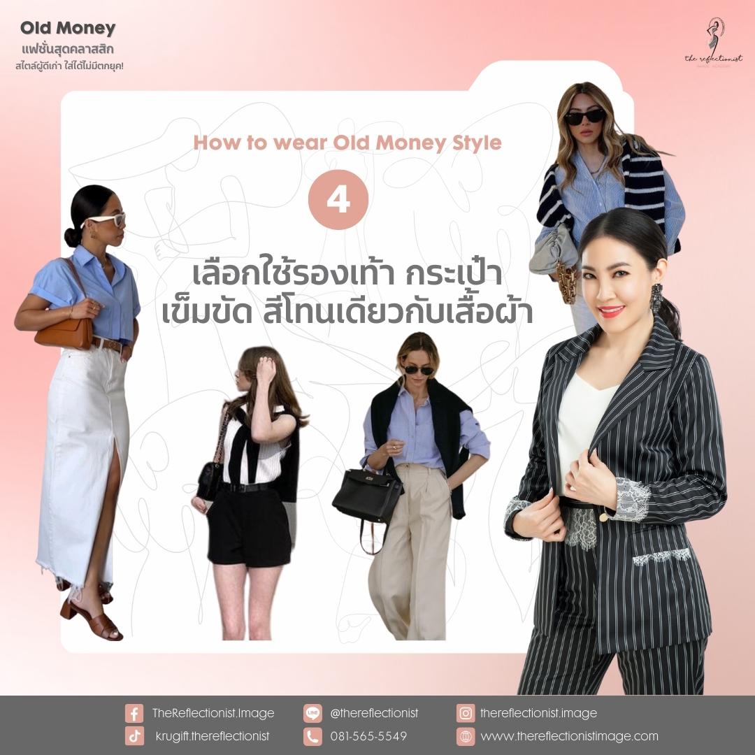 การแต่งตัวแบบ Old Money Style จะเน้นแต่งตัวให้มีความคลีน Complete Look ที่ได้ทั้งตัวจะมีสีโทนไปทางเดียวกัน ดังนั้นการเลือกเข็มขัด กระเป๋า และรองเท้า ส่วนใหญ่มักจะเลือกสีที่มีโทนเดียวกับสีของเสื้อผ้า หรือไม่ก็เลือกเป็นสีเดียวกันทั้งหมดตัดกับสีของเสื้อผ้า เช่น ใส่เสื้อผ้าสีขาวทั้งชุด แต่เลือก Accessory เป็นสีดำ หรือสีน้ำตาล หรือจะเป็นใส่เสื้อผ้าสีฟ้าขาว แต่เลือก Accessory เป็นสีดำ หรือสีน้ำตาล นั่นเองค่ะ