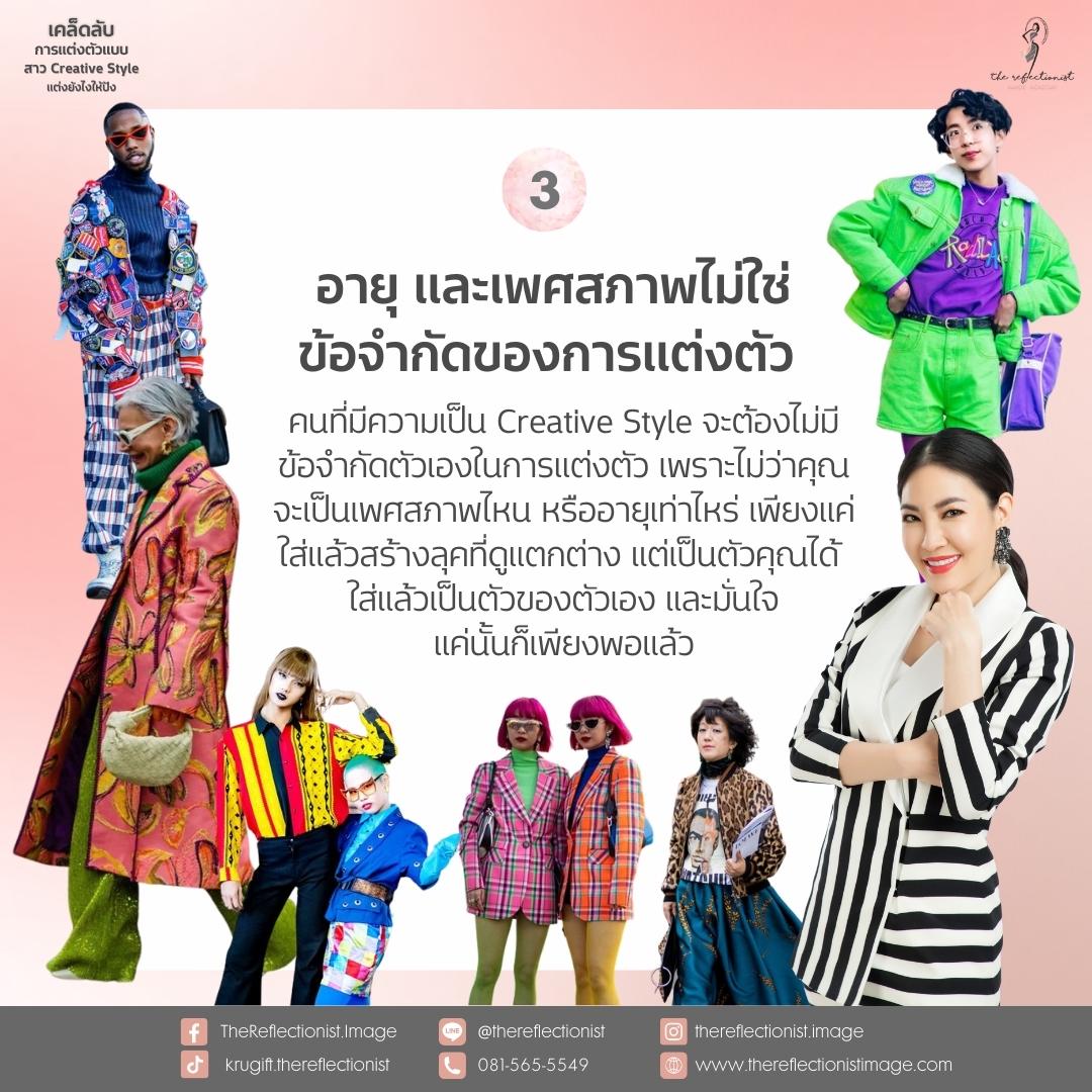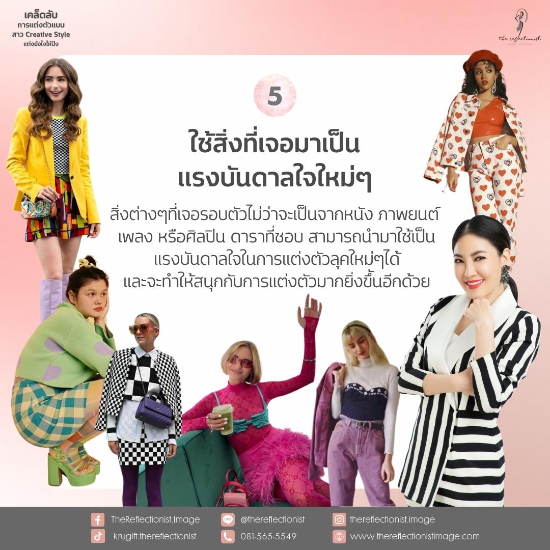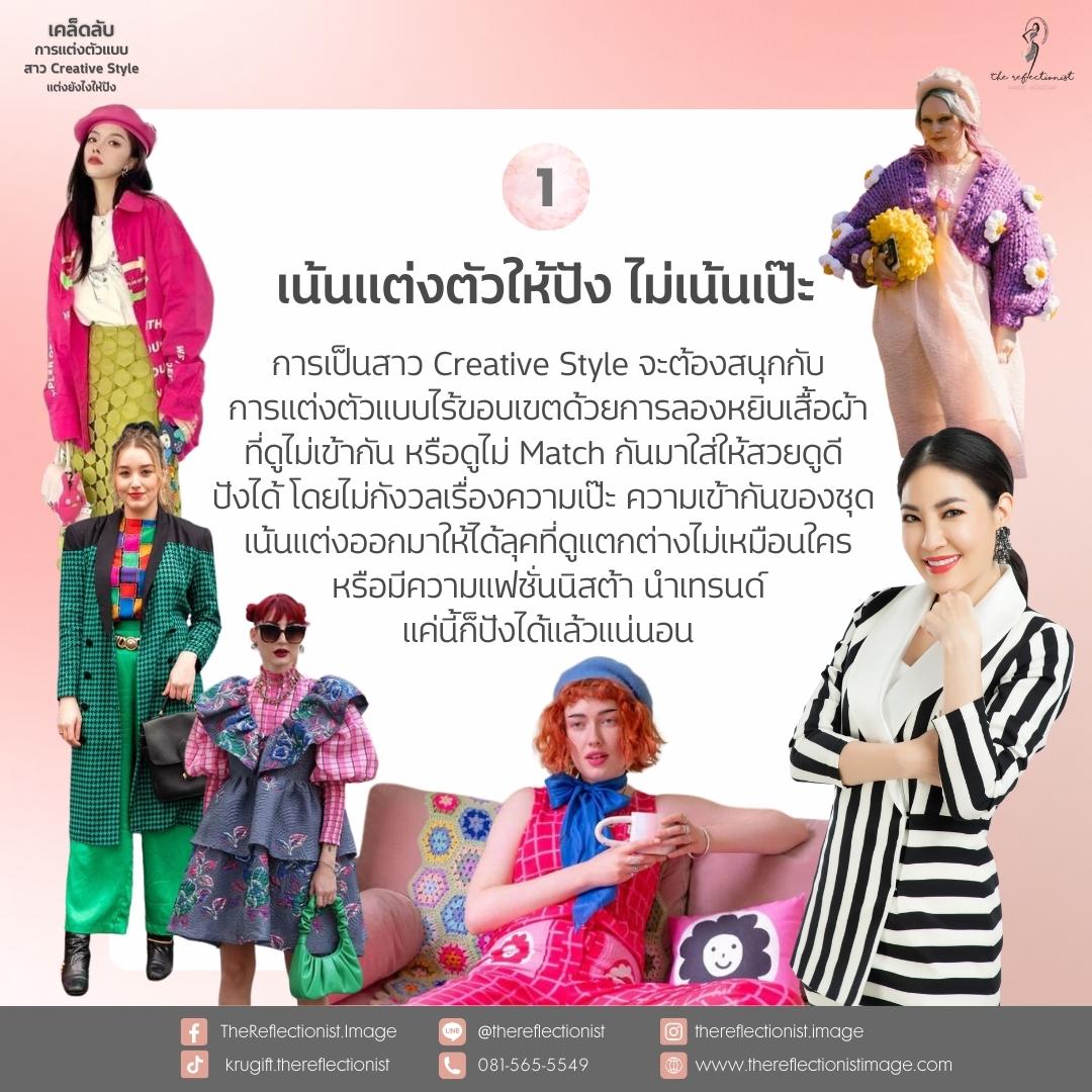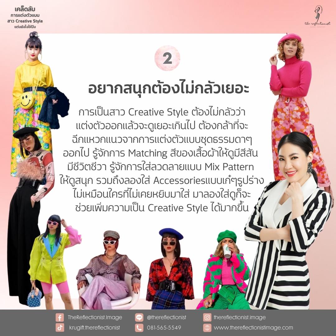ซึ่งการเป็นสาว Creative Style นั้น พวกคุณต้องกล้าที่จะลองแต่งตัว ออกจากกรอบความกลัวว่าจะถูกคนมองด้วยสายตาแบบไหน หรือโดนทักแบบใด แต่ให้มั่นใจในการพรีเซนต์ความเป็นสไตล์ของคุณออกมาว่า “นี่แหละคือตัวฉัน นี่คือสไตล์การแต่งตัวของฉัน” สนุกไปกับการแต่งตัวของพวกคุณเองอย่างเต็มที่ แค่นี้การเป็นสาว Creative Style ของคุณก็ไม่ใช่เรื่องยากอีกต่อไปแล้วค่ะ ลองนำไปปรับใช้ในการแต่งตัวของคุณดูนะคะ
