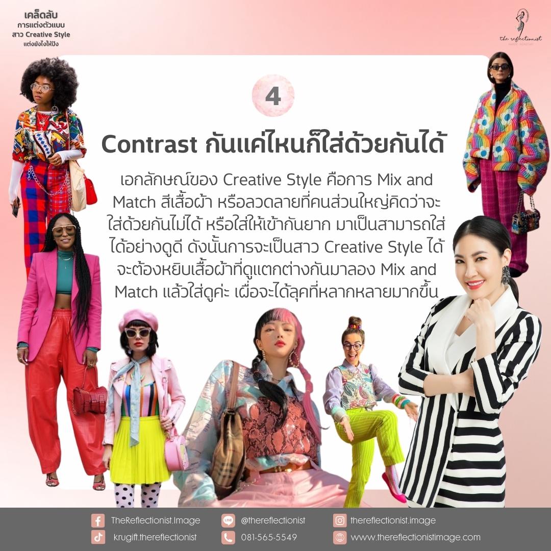 เอกลักษณ์ของ Creative Style คือการ Mix and Match สีเสื้อผ้าที่คนส่วนใหญ่คิดว่าจะใส่ด้วยกันไม่ได้ หรือใส่ให้เข้ากันยาก มาเป็นสามารถใส่ได้อย่างดูดี ดังนั้นการจะเป็นสาว Creative Style ได้จะต้องหยิบเสื้อผ้าที่ดูแตกต่างกันมาลอง Mix and Match แล้วใส่ดูค่ะ เผื่อจะได้ลุคที่หลากหลายมากขึ้น