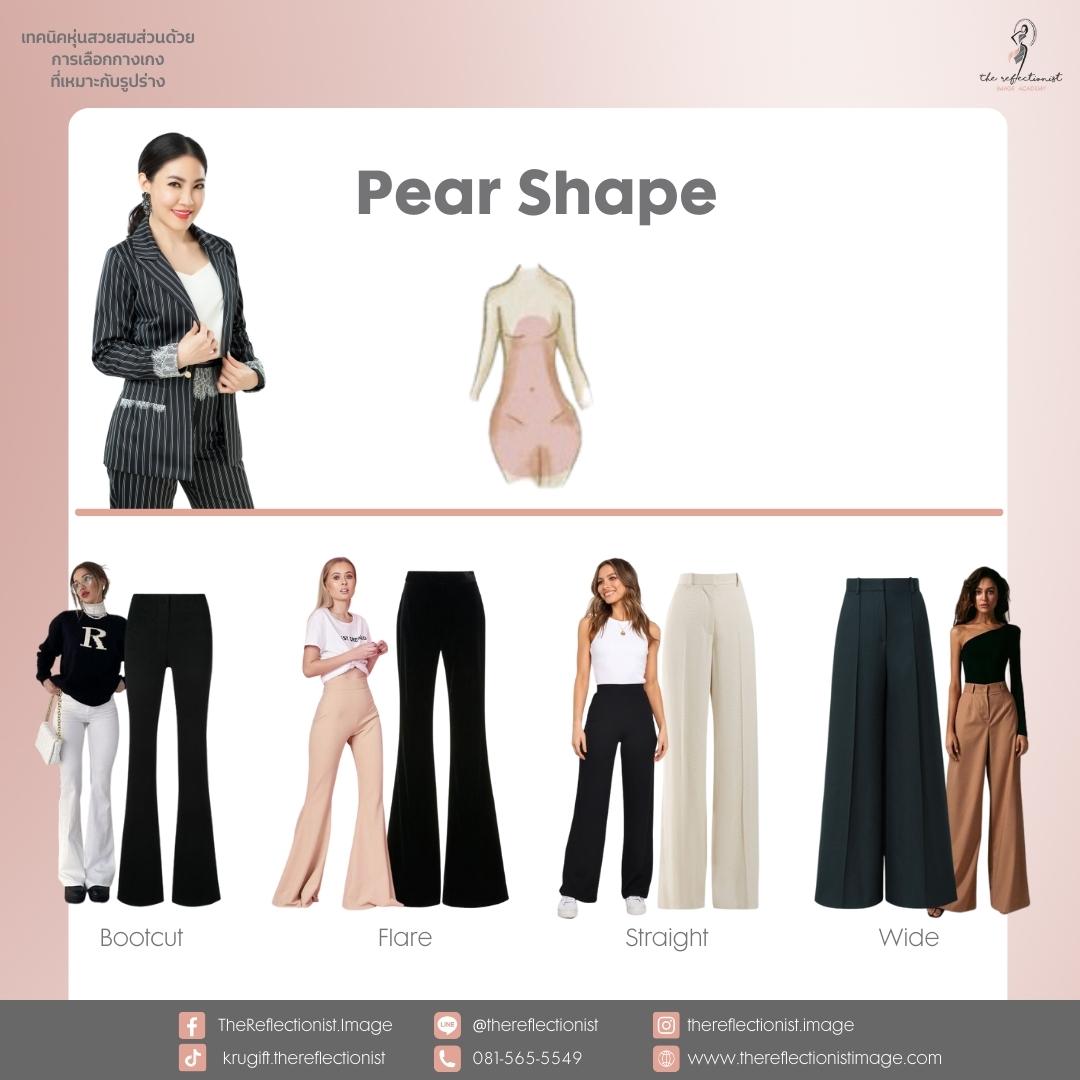 คนที่มีรูปร่างแบบ Pear Shape คือคนที่มีช่วงล่างใหญ่ทำให้รู้สึกไม่มั่นใจบริเวณต้นขา และสะโพก กางเกงที่เหมาะกับสาวหุ่น Pear Shape ที่ครูกิ๊ฟอยากแนะนำก็คือ กางเกงทรง Bootcut, Flare, Straight, และ Wide ค่ะ