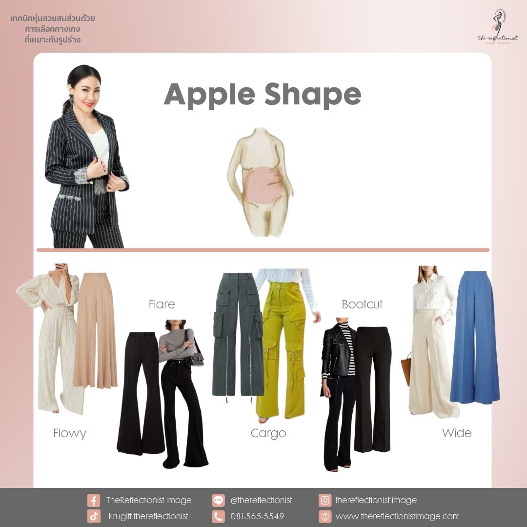 คนที่มีรูปร่างแบบ Apple Shape สิ่งที่เป็นจุดกังวลของคนรูปร่างนี้คือการมีหน้าท้อง แต่ข้อดีคือมักจะมีขาที่เล็กกางเกงที่ครูกิ๊ฟแนะนำก็คือกางเกงทรง Flowy, Flare, Cargo, Bootcut, และ Wide