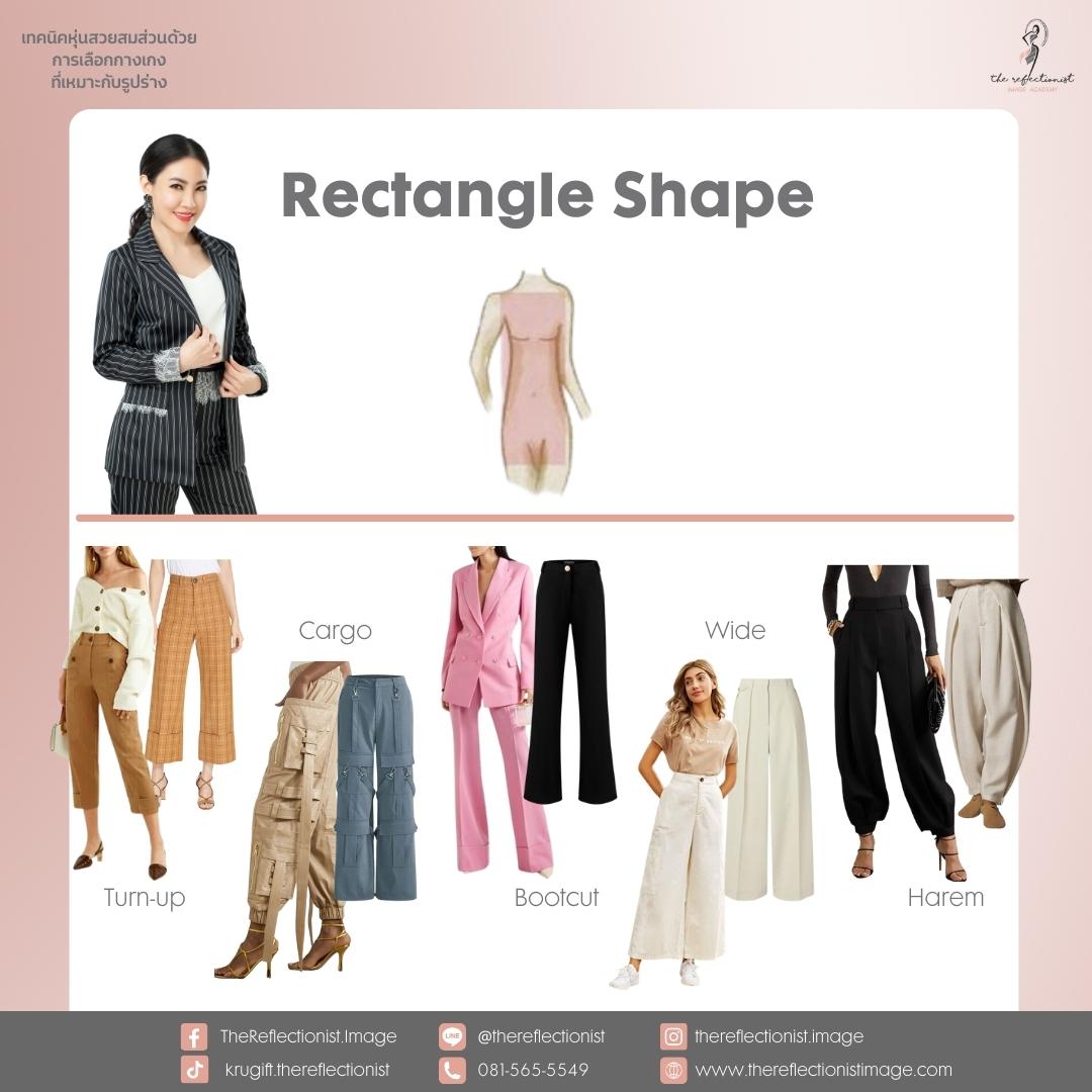 กางเกงที่จะเหมาะกับสาวหุ่น Rectangle Shape ก็คือ กางเกงทรง Trun-up, Cargo, Bootcut, Wide, และทรง Harem