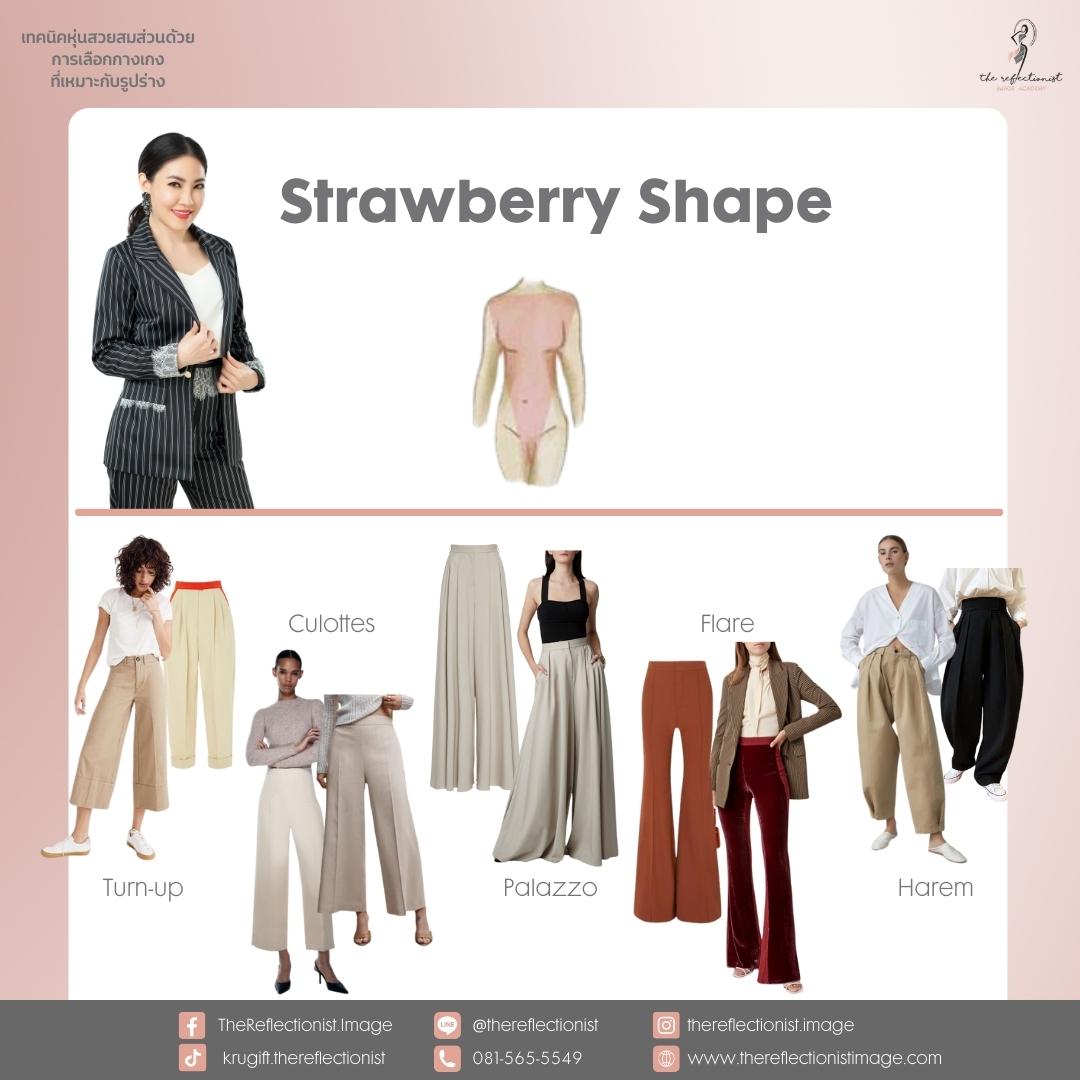 รูปร่างStrawberry Shape หรือรูปร่างแบบสามเหลี่ยมคว่ำ มักมีจุดกังวลบริเวณช่วงบนของลำตัวอย่างไหล่ หรือหน้าอก แต่พวกคุณสามารถเสริมความสมส่วนให้กับรูปร่างของคุณได้ด้วยการใส่กางเกงที่ช่วยทำให้ช่วงล่างดูBalanceกับช่วงบน ซึ่งกางเกงที่เหมาะกับสาวหุ่นStrawberry Shape คือ กางเกง Turn-up, Culottes pants, Palazzo, Flare, และการเกงทรง Harem