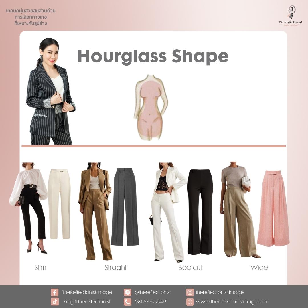 รูปร่างที่สมส่วนแบบนี้ทำให้สาวหุ่น Hourglass โชคดีตรงที่สามารถใส่กางเกงได้เกือบทุกแบบเลยค่ะ ซึ่งกางเกงที่ครูกิ๊ฟแนะนำที่จะช่วยส่งเสริมหุ่นHourglass คือ กางเกงทรง Slim, Straight, Bootcut, และทรง Wide